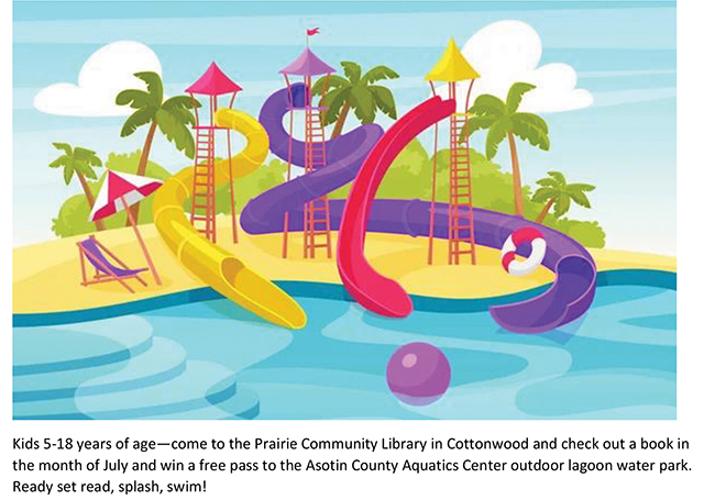 Prairie Community Library has a program going on where youngsters ages 5-18 can check out a book in July and get a waterpark pass to the Asotine County Aquatic Center. Click on the photo for a larger view.