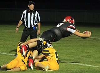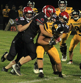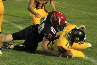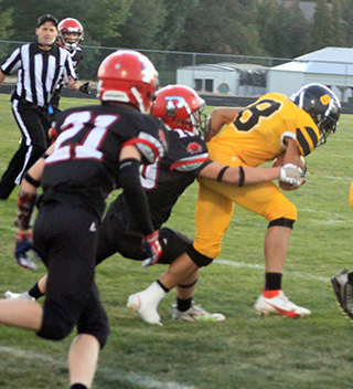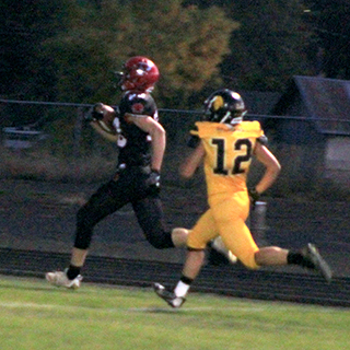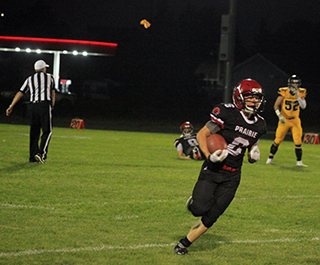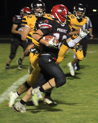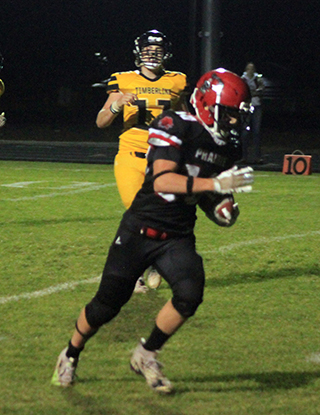The Prairie football team bounced back from a loss with a 52-6 win over Timberline in their home opener Thursday, September 14 at Cottonwood. ![]() Prairie kicked off to open the game and the ball went out of bounds at the Timberline 45 but was touched by a Timberline player. Timberline faced a third and 6 and quarterback Korbin Christopherson’s pass went off of Levi Gehring’s back and Levi McElroy wound up making the interception at the Prairie 45 and returned it to the Timberline 44. Prairie needed 10 plays to cover the 44 yards for their first touchdown. There were 2 incomplete passes with 8 running plays. Quarterback Noah Behler capped off the drive by running a bootleg around right end for 5 yards. The 2-point try failed leaving Prairie with a 6-0 lead. Prairie tried an onside kick but Timberline recovered at their own 45. A fumbled snap cost them 6 yards on their first play and they wounding up facing fourth and 17 at their own 38. The pass attempt went high and Prairie took over at the Timberline 38. Gehring burst through the middle on the next play and went all the way to the end zone. Behler ran in the 2-point attempt to five Prairie a 14-0 lead. Prairie again tried an onside kick and this time Tristian Mader came up with the ball at the Timberline 49 after it bounced off a Timberline defender. On the next play Behler passed to Bennie Elven on a little flare pattern to the right side and Elven was able to go all the way to the end zone for a 49 yard scoring play. Behler again ran in the 2-pointer for a 22-0 lead with 4:37 still left I the first quarter. Prairie had scored twice within 11 seconds. Timberline took over at the Prairie 49 and managed to put together their only scoring drive of the game. They picked up 20 yards on a running play to move to the 29. After 2 more suns picked up 4 yards, Christopher passed to Darrin Bonner crossing over the middle and Bonner went 25 yards for a touchdown. The 2-point run was stopped short by the Pirates, making it 22-6. Each team turned the ball over on downs on their next possessions with Prairie eventually taking over at the Timberline 44. Behler passed to Gehring on the right side for 33 yards. A roughing the passer penalty on the play added 6 more yards and moved the ball to just outside the 5 yard line. Behler ran a quarterback draw on the next play for 5 yards and another Pirate touchdown. The 2-point try failed as Prairie led 28-6 with 10:37 left in the half. On Timberline’s next possession Jake Quintal sacked Christopherson for a 10 yard loss that led to a fourth and 16 play from the Timberline 36. Apparently Timberline doesn’t have a punter as they went for it and the pass was incomplete. Prairie took over at the 36. Behler passed to Blake Bunce for 6 yards then Chris Schumacher gained 18 yards on a run to the right. After an incomplete pass, Behler gained 3 yards on a keeper. On third and 7, Behler rolled out to the right and was rushed. He was able to duck out of a tackle attempt and threw the ball to Schumacher in the end zone for a touchdown. The 2-point try failed with Prairie now leading 34-6 with 6:30 left in the half. Timberline had the ball for only 1 play after the kickoff as Bunce intercepted Christopherson’s pass at the Timberline 42 and returned it to the 28. Behler passed to the left to Gehring for a 20 yard gain that set up first and goal at the 8. On the next play Schumacher caught his second touchdown pass. The 2-point run was stopped short but Prairie now led 40-6. Timberline gave the ball right back as they fumbled on the kickoff return with Gehring recovering at the Timberline 45. Prairie wasn’t able to moved the ball and gave the ball back to the Spartans after 4 plays. Timberline was able to move the ball down to the Prairie 29 before turning the ball over on downs at that point. Behler connected with Gehring for 36 yards on the first play to move to the Timberline 35. The Spartans were called for defensive holding on the next play to move the ball to the 25. On 2nd and 9, Behler passed to Gehring for a big gain but all but 14 yards of it was called back on an illegal block that pushed Prairie back to the 20. On the next play Behler passed to a wide open Elven who juggled the ball before pulling it in and going to the end zone for a touchdown. The 2-point try failed but Prairie now led 46-6 with 26 seconds left in the half. Timberline tried to move the ball and get on the board before halftime but Gehring intercepted at the Prairie 44 on the last play of the half. The 40 point margin meant the entire second half would be played with a running clock. Timberline kicked off to start the second half and tried an onside kick but it didn’t go 10 yards and Prairie took over at the Timberline 49. However Prairie gave Timberline the ball on the next play with a fumble that the Spartans recovered at their own 43. The Spartans put together 4 first downs and had a first and goal at the Prairie 4 yard line. Christopherson fumbled the ball on the next play and Quintal recovered at the 4. Timberline gave the Pirates 5 yards on an encroachment penalty. Schumacher and Gehring each picked up 3 yards to give Prairie a first down at the 15. Behler then passed deep downfield to Elven for a 45 yard gain to the Timberline 40. Gehring picked up 13 yards on a run to the left to move the ball to the 27. Gehring then ran a counter back to the left side for 18 more yards to set up first and goal at the 9. On the next play Behler threw a slant pass to the left side to Bunce who scored. Prairie had just put together a 96 yard scoring drive. The 2-point pass failed making it 52-6 with 10:54 to play. Timberline’s next possession ended with Gehring making an interception and returning it 11 yards to the Timberline 14. Prairie gave the ball right back on a fumbled snap. Timberline couldn’t move the ball and turned it back on downs at the 14. Prairie had the JV offense on the field and they weren’t able to moved the ball 