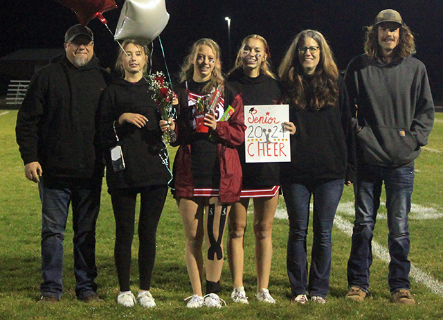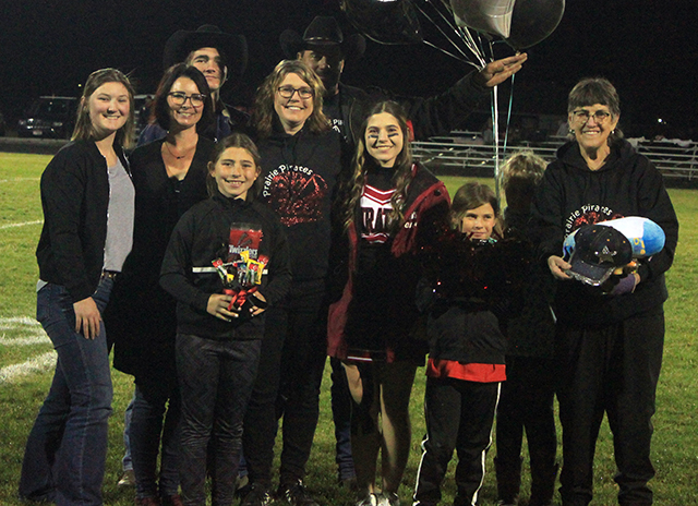 Prairie turned the ball over on downs at the 28.Passes of 37 and 14 yards from Schilling to Fabbi moved the Rams deep into Pirates territory at the 21. C.V. wound up finished the drive with a 1 yard run by Schilling. They added the 2-pointer to make it 38-8 with 10:18 to play. C.V. tried an onside kick but the ball went right to Gehring who caught the ball at the Prairie 48. A holding penalty set the Pirates back but an 18 yard run by Uhlenkott and a 5 yard run by Behler gave Prairie a first down at the 39. Prairie then converted a third and 11 with a 15 yard keeper by Behler. On second and 8 from the 23, Behler passed to Bunce to give the senior a touchdown on senior night. A senior night special 2-point play also worked as Behler passed to VonBargen for the conversion. That made it 46-8 with 6:44 left to play. On C.V.’s next possession Jake Quintal sacked Schilling for 10 yards on second and 5 and Wemhoff sacked him for a 7 yard loss on third and 15. That left the Rams facing fourth and 22 from their own 26. Schilling looked to pass but wound up running for 12 yards with Prairie taking over at the C.V. 38. Behler connected on second and 6 to Elven for an 18 yard gain. Elven broke 3 tackles as he tried to get a senior night touchdown but was stopped at the 16. Another pass to Elven was wiped out by a penalty. Behler was sacked for a 9 yard loss and his fourth down pass attempt to Elven fell incomplete. C.V. took over at their own 22 and Wemhoff picked up another sack as he tackled Schilling at the 13. C.V. converted the first down on a 17 yard run then got 43 on a pass but the clock ran out on the play. Uhlenkott had another big day running the ball as he had 161 yards on 25 carries with 2 touchdowns. Behler added 65 yards on 12 carried and Gehring 26 on 8 carries as Prairie had 260 yards rushing on 47 attempts. Behler was 10 for 16 passing with 1 interception for 148 yards. Gehring caught 4 passes for 67 yards. Elven caught 4 for 52 and Bunce caught 2 for 29. C.V. had 84 yards rushing on 33 attempts led by Schilling who had 60 yards on 24 attempts. Schilling was 8 for 18 passing with an interception for 175 yards. Fabbi had 5 catches for 116 yards. With the win Prairie improves to 5-2 on the season and 4-2 in league play. They end their regular season this Friday, Oct. 20 at league leading and undefeated Logos in Moscow at 7 p.m. Prairie is locked into fourth place in the league standings as even if they beat Logos they wouldn’t have the tiebreaker against the Potlatch-Kamiah loser as they lost to both teams. A win though would probably help their MaxPreps rankings which determine who the at-large teams will be in the state playoffs. Only the top 3 teams in the White Pine are guaranteed spots in the playoffs. Prairie 16 14 8 8 -46 C.V. 0 0 0 8 - 8 P-Uhlenkott 7 run (Behler run) 4:56 1st P-Gehring 10 pass from Behler (Uhlenkott pass from Behler) 0:44.9 1st P-Uhlenkott 21 run (Behler run) 9:05 2nd P-Gehring 44 pass from Behler (pass failed) 2:38 2nd P-Behler 6 run (Gehring pass from Behler) 7:13 3rd CV-Schllling 1 run (Myers run) 10:18 4th P-Bunce 23 pass from Behler (VonBargen pass from Behler) 6:44 4th ![]() Bennie Elven runs with the ball after catching a pass. ![]() Levi Gehring is about to catch a deep pass that he turned into a touchdown. ![]() Blake Bunce grabs a leg as he tackels a C.V. runner. Also shown are Noah Behler and Carter Shears. ![]() Noah Behler throws a stiffarm at a C.V. defender on a quarterback run. ![]() Dylan Uhlenkott bursts through the line for a long gainer. Also shown is Carter Shears. ![]() Bennie Elven was honored on Senior Night and is shown with his family. ![]() Blake Bunce is shown with his mom on Senior Night. ![]() Ethan VonBargen is shown with his parents on Senior Night. ![]() Noah Behler is shown with his family on Senior Night. ![]() Trenton Lorentz is shown with his family on Senior Night. He will return to action for the Pirates this week at Logos. ![]() Senior Cheerleader Meghan Fowler is shown with her family during halftime of the football game last Friday. ![]() Senior Cheerleader Miranda Klapprich was also honored on Senior Night and is shown with her family. SEPTEMBER