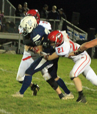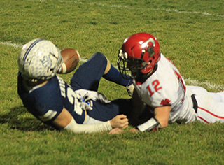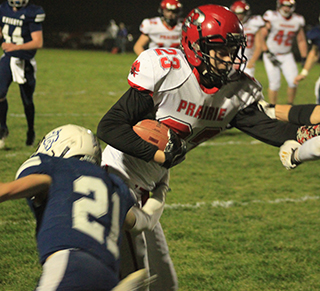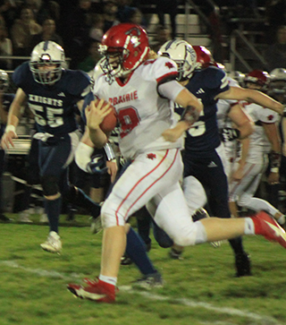 2-point conversion the Knights now led 16-46.Prairie gave the ball back on downs and Logos added another touchdown to go up 16-52 with 2:25 left in the third quarter. The Pirates got back on the scoreboard in their next possession with a 9 play, 65 yard scoring drive. A 30 yard pass to Elven moved the ball into Logos territory at the 35. 24 yards on 3 carries by Lorentz helped move the ball down to the 15. On third and 5 at the 10, Behler found Levi Gehring open on the right side for a touchdown. Behler ran in the 2-pointer to cut the deficit to 24-52. Logos answered right back with a 2-play, 60 yard scoring drive. Prairie stopped the 2-point run but Logos now led 24-58. On Prairie’s next possession a 33 yard pass to Lorentz moved the Pirates to the Logos 35. 2 plays later Behler carried the ball for 25 yards but fumbled at the end with Elven recovering at the 9 for first and goal. Lorentz carried the ball into the end zone on the next play. Behler scored the 2-point er to make it 32-58. Elven appeared to recover an onside kick attempt but the referees gave the ball to Logos at the 50 as the ball didn’t hit the ground first before the recovery. Logos needed 5 plays to added another touchdown. With the 2-pointer it was now 32-66 with 4:29 to play. Prairie answered right back as Behler connected with Lorentz for a 70 yard touchdown on the first play after the kickoff. Behler ran in the 2-pointer to make it 40-66. Prairie tried another onside kick but Logos recovered at the 50. The Knights moved down to the Prairie 5 but wound up turning the ball over on downs. Prairie tried 4 pass plays but the only completion was for 0 yards as time ran out. Prairie had 148 yards rushing on 40 attempts led by Lorentz who had 84 yards on 22 carries. Behler added 61 yards on 10 carries. Behler competed 9 of 16 passes with 1 interception for 203 yards. Lorentz caught 4 passes for 124 yards. Elven caught 4 for 69 and Gehring caught 1 for 10. Logos had 118 yards rushing on 25 attempts led by Driskill who had 89 yards on 16 attempts. Driskill completed 20 of 28 passes for 364 yards. With the loss, Prairie finishes their season with a record of 5-3. They were 4-3 in league, good for fourth place. Prairie 8 8 0 24 -40 Logos 8 24 20 14 -66 P-Behler 3 run (Elven pass from Behler) 5:23 1st L-Carlson 54 pass from Driskill (Morrill run) 5:13 1st L-Driskill 13 run (Morrill pass from Driskill) 8:10 2nd P-Elven 16 pass from Behler (Lorentz pass from Behler) 6:31 2nd L-Comis 2 pass from Driskill (P. Grieser pass from Driskill) 4:28 2nd L-Morrill 9 pass from Driskill (Grieser pass from Driskill) 0:21 2nd L-Driskill 14 run (pass failed) 8:58 3rd L-Sundlie 16 run (Grieser pass from Driskill) 5:20 3rd L-Sundlie 1 run (pass failed) 2:28 3rd P-Gehring 10 pass from Behler (Behler run) 9:53 4th L-Sundlie 10 pass from Driskill (run failed) 9:27 4th P-Lorentz 9 run (Behler run) 6:59 4th L-Carlson 32 pass from Driskill (Daniels pass from Driskill) 4:29 4th P-Lorentz 70 pass from Behler (Behler run) 4:13 4th ![]() Matt Wemhoff sacks the Logos quarterback.. ![]() Noah Behler gained big yardage on this run. ![]() Bennie Elven runs with the ball after making a catch. ![]() Bennie Elven and Levi McElroy combine to tackle a Logos runner for a loss. SEPTEMBER