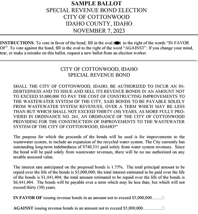 City of Cottonwood to run bond election on Tuesday The City of Cottonwood is running a bond election on November 7. The bond election authorizes the Council to utilize loan funds needed to access grants offered from the Idaho Department of Environmental Quality. A successful bond election will: * Allow the City to comply with Clean Water Act Standards * Allow full access to $23.1 Million in grants offered by Idaho DEQ * Show community support to pursue other funding & grant opportunities The project, estimated at $27.6 Million, will eliminate current discharge to Cottonwood Creek and construct facilities to store and reuse wastewater over the growing season. The State requires compliance by 2028 to avoid maximum penalties of $5,000 per violation per day. The City is actively pursuing additional funding sources to minimize rate impacts and a phased rate increase is planned over the next 3-5 years. Since the bond will be paid solely from wastewater revenue, there will be no tax authorized on any taxable assessed value. The actual amount financed would be subject to decision by Council not to exceed the $5 Million maximum. Polls will be open next Tuesday from 8 a.m. to 8 p.m. ![]() Timeline for the project. ![]() A sample ballot for next Tuesday's election. |