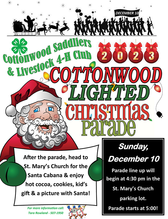 The annual Cottonwood Lighted Christmas Parade is set for Sunday, Dec. 10 at 5 p.m. Lineup will be at the St. Mary’s Church parking lot starting at 4:30 p.m. The