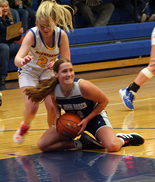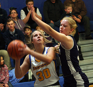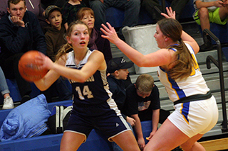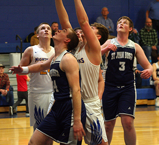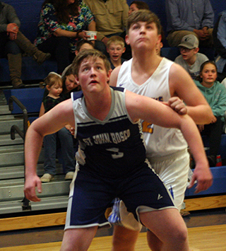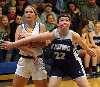 won against Nezperce earlier this season.The Patriots came out strong as they took a 12-6 lead by the end of the first quarter. Nezperce came back in the second quarter to outscore the Patriots 9-13 to pull within 2 at the half, 21-19. The Nighthawks then dominated the third quarter, outscoring Bosco 2-12 to take a 23-31 lead into the fourth quarter. Nezperce edge the Patriots 9-11 in the fourth quarter to make the final margin of 10 points. Waters led the Patriots in scoring with 19 points. Wassmuth scored 5, Raylie Warren 3 and Dahlsrud and Miah Mager added 2 each. The Lady Patriots are now 2-2 in league play and 6-4 overall. St. John Bosco 12 9 2 9 -32 Nezperce 6 13 12 11 -42 SJB-Seubert 0 0-0 0, Dahlsrud 0 2-2 2, Perrin 0 0-0 0, Wassmuth 2 0-0 5, Chmelik 0 0-0 0, A. Warren 0 0-0 0, Mager 1 0-0 2, R. Warren 2 0-4 4, Sonnen 0 0-4 0, Sarah Waters 8 2-3 19. 3-pointers-Wassmuth, Waters. Nezperce-M. Horton 3 0-0 6, Lux 1 0-0 2, Duuck 0 0-0 0, Wilcox 0 0-0 0, Zenner 6 2-2 16, Duuck 0 0-0 0, Kirkland 0 0-0 0, I. Horton 0 0-0 0, Grant 6 6-10 18. 3-pointers-Zenner 2. Boys at Nezperce The Patriots lost to Nezperce for the second time this season.Nezperce jumped all over the Patriots in the opening quarter as they took a 9-19 lead. Nezperce extended the lead to 21-38 by halftime and 35-53 after 3 quarters. The Patriots rallied in the fourth, outscoring the Nighthawks 24-15, but could only cut the margin down to 9. Levi Wassmuth had his highest scoring game of the year with 27 points to lead all scorers. Sam Weckman added 9 points with Cody Weckman adding 8, Hoene 7, Nathan Wassmuth 4, Noah Beckman 3 and Tommy Rose 1. The Patriots are now 3-9 on the season and 1-5 in league play. St. John Bosco 9 12 14 24 -59 Nezperce 19 19 15 15 -68 SJB-Beckman 0 3-6 3, Nuxoll 0 0-0 0, Rose 0 1-2 1, Hoene 3 0-2 7, C. Weckman 2 2-6 8, N. Wassmuth 2 0-0 4, L. Wassmuth 10 7-16 27, S. Weckman 3 3-10 9. 3-pointers-C. Weckman 2, Hoene. Nezperce-Mosman 0 0-0 0, Ingram 0 0-0 0, Cronce 2 0-0 4, C. Williams 7 0-0 21, B. McLeod 1 1-2 3, Wilcox 2 3-7 7, A. McLeod 2 5-6 9, Kirkland 6 2-7 14, J. Williams 1 0-0 2, Warren 3 1-3 8. 3-pointers-C. Williams 7, Warren. ![]() Julia Wassmuth drives downcourt at Nezperce. ![]() Miah Mager blocks out for a rebound at Nezperce. ![]() Noelle Chmelik looks to pass. ![]() Rachel Sonnen and Catherine Seubert block out for a possible rebound. ![]() Sarah Waters goes to the floor for a loose ball. ![]() Rachel Sonnen plays defense at Nezperce. ![]() Levi Wassmuth brings the ball upcourt at Nezperce. Also shown are Sam Weckman and Nathan Wassmuth. ![]() Noah Bekcman blocks out for a rebound. ![]() Stallone Hoene puts up a shot at Nezperce. ![]() Tommy Rose has the ball at Nezperce. ![]() Levi Wassmuth and Noah Beckman look up to see if the ball goes in. All photos by Steve Wherry of the Lewis County Herald. ST. JOHN BOSCO BOYS AND GIRLS HIGH SCHOOL BASKETBALL SCHEDULES NOVEMBER 21-Girls at C.V., 6 p.m., postponed due to illness at C.V.30-Girls at Logos, 6 p.m., won 26-19 30-Boys vs. Logos Online at Logos gym, 7:30 p.m., won 56-14 DECEMBER 4-Girls, Boys at Salmon River, 6 p.m. MST, girls lost 32-35, boys lost 38-618-Girls, Boys vs. Timberline* at Highland, 5 p.m., girls won 38-26, boys lost 31-60 9-Girls, Boys vs. Nezperce* at Highland, 1 p.m., girls won 32-27, boys lost 47-60 14-Girls, Boys home game vs. Highland* at Highland, 6 p.m., girls won 32-26, boys lost 40-64 15-Girls, Boys at Deary*, 6 p.m., girls lost 25-44, boys lost 40-74 29-30-Girls won 43-7 over Coeur d'Alene Catholic School, boys lost twice JANUARY 6-Girls, Boys vs.Salmon River at Highland, 5 p.m., girls lost by 1, boys won 9-Boys at C.V., 6 p.m., lost 54-63 11-Girls, Boys vs. Kendrick* at Highland, 6 p.m., postponed due to weather 16-Girls, Boys at Timberline*, 6 p.m., girls won 43-17, boys won 45-43 18-Girls, Boys at Nezperce*, 6 p.m., girls lost 32-42, boys lost 59-68 23-Girls, Boys vs. Deary* at Highland, 6 p.m., girls lost 20-47; boys lost 56-63, details next week 25-Girls, Boys at Highland*, 6 p.m. 26-Girls, Boys vs Kendrick at Highland, 6 p.m., makeup for Jan. 11 postponement 29-Girls vs. Clarkston JV, 6 p.m., Boys vs. Logos Online, Senior Night, 7:30 p.m. 30-Girls, Boys at Kendrick, 6 p.m. Feb.-Boys to play Clarkston JV or C, home & away, dates and sites to be determined. Feb. 2-9-Girls District Feb. 15-17-Girls State Feb. 19-23-Boys District Feb. 29-March 2-Boys State |