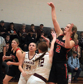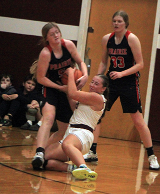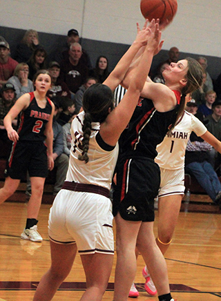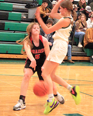 Lady Pirates win twice They were to play C.V. in their District opener on Tuesday, Jan. 30. With a win they would likely play Kamiah at 6 p.m. Saturday, Feb. 3 at Lewiston High School. They take an 8-game winning streak into the District Tournament. At Kamiah The game at Kamiah was a defensive-minded battle with the league’s #2 seed into District going to the winner.![]() Prairie’s Kylie Schumacher and Kamiah’s Emma Krogh pretty much cancelled each other out in the game as neither was able to score much. Also, Prairie’s Lexi Schumacher’s shooting eye was off in the game as she went scoreless through the first 3 quarters. Stepping up big for the Pirates though was Sage Elven who led all scorers with 22 points. Hailey Hanson got things started by hitting a 3-pointer for the game’s first points. Kamiah answered with a basket then Elven took over. She scored the next 4 points on a pair of turn-around bank shots to make it 7-2. After a Kamiah basket, Elven scored inside again to make it 9-4 after 1 quarter. After a Kamiah free throw, Prairie scored 7 straight. Elven scored a pair of lay-ups and Hanson concerted a 3-point play for a 16-5 lead. After a Kamiah baskets, Elven and Alli Geis each scored to put Prairie up 20-7 with 2:50 left in the half. Things then went sideway for Prairie as they started turning the ball over and fouling on made shots. Kamiah converted back to back 3-point plays then added a 3-pointer. A drive for a lay-up in the final seconds cut Prairie’s 13-point lead down to just 2 at the half, 20-18. Kamiah scored the first 2 points of the second half to tie the score and the Kubs had a chance to take the lead with a free throw but missed. A basket by Elven and a 3 by Hanson put Prairie back up by 5. Kamiah answered with a pair of baskets by Laney Landmark to pull within 1. Prairie then closed the third quarter with a 6-0 run to take a 31-24 lead into the fourth. Elven scored all 6 points. Lexi Schumacher finally got on the scoreboard to open the fourth quarter as she made a 3-pointer. Elven added a free throw to put Prairie up 35-24. A Kamiah 3-pointer was answered with a basket by Sydney Shears. A basket by Kamiah was answered with a free throw by Kylie Schumacher, her only point of the game. Kamiah whittled another point off the lead when a basket was answered by a free throw by Elven. Kamiah then got within 4 on a basket each by Landmark and Krogh. Lexi Schumacher made the second of 2 free throws and Kamiah answered with a free throw to make it 40-36 with 30 seconds to play. Prairie then scored the final 3 points to hold on for the win. Lexi Schumacher made 2 free throws with 22 seconds left and Shears made the second of 2 free throws with 9 seconds left. Elven had a double-double with 22 points and 15 rebounds. Hanson scored 9 points while Lexi Schumacher scored 6, Shears 3, Geis 2 and Kylie Schumacher 1. Prairie had a 43-31 advantage on the boards with Kylie Schumacher also having 15 rebounds. Elven had 4 steals and Kylie and Lexi Schumacher each had 5 assists. Prairie was 16 for 47 from the field, 34%, and 8 for 15 at the line, 53%. Kamiah was 15 for 52 from the field, 29%, and 4 for 10 at the line, 40%. The Prairie JV team closed out their season with a 51-17 win over the Kubs. Ellie Nuxoll got the scoring started with a lay-up and Avery Riener followed with a 3-pointer to make it 5-0. Kamiah came back to cut the lead to 8-6 then Prairie closed out the first quarter with a 10-0 run. Nuxoll scored 6 of those points and Nadia Cash scored the other 4 as Prairie led 18-6 at the end of the quarter. The two teams traded baskets through the second quarter with Nuxoll adding 6 more points while Halee Rowland and Maggie Nuxoll each scored 2 as Prairie took a 28-14 lead at the half. Prairie dominated the third quarter as they outscored Kamiah 20-0 to take a 48-14 lead and invoke the running clock for the entire fourth quarter. Rowland hit 4 of 5 shots for 8 points in the third quarter while Aubree Rehder sank a pair of 3’s and Erica Schlader hit 3 of 4 shots for 6 points each. Kennedy Riener had Prairie’s only fourth quarter points on a 3-pointer while Kamiah made a basket and a free throw. Kamiah broke a scoring drought of nearly 12 minutes when they scored their basket in the fourth quarter. Ellie Nuxoll wound up with a double-double of 15 points and 11 rebounds, all in the first half, to lead the team in both categories. Rowland scored 10, Rehder 8, Schlader 6, Cash 3, Avery and Kennedy Riener 3 each and Maggie Nuxoll 2. Prairie had a 40-31 rebounding edge. Cash had 5 steals and 4 assists while Rowland had 3 steals and 4 assists. The JVs were 21 for 62 from the field, 34%, and 3 for 10 at the line, 30%. Kamiah was 6 for 30 from the field, 20%, and 4 for 11 at the line, 36%. Prairie 9 11 11 12 -43 Kamiah 4 14 6 12 -36 Prairie-L. Schumacher 1-12, 3-4, 6; Hanson 3-7, 1-3, 9; Geis 1-1, 0-0, 2; Elven 10-20, 2-4, 22; K. Schumacher 0-4, 1-2, 1; Shears 1-4, 1-2, 3. 3-pointers-Hanson 2, L. Schumacher. Kamiah-Krogh 1-7, 1-2, 3; Landmark 4-8, 1-1, 9; Loewen 0-2, 0-0, 0; Porter 4-9, 0-1, 8; Skinner 5-15, 1-2, 13; Schoening 0-7, 1-4, 1; Hunt 1-4, 0-0, 2. 3-pointers-Skinner 2. At Potlatch The game at Potlatch was lopsided as Prairie easily won. Lexi Schumacher scored the game’s first 7 points on a 3 followed by a pair of 2’s.Potlatch scored a basket then Prairie scored the next 8 points to take a 15-2 lead. Kylie Schumacher scored 2 baskets while Elven added a lay-up and Hanson made 2 free throws. Potlatch scored 4 for the next 6 points with Elven scoring a basket for Prairie. Prairie then closed out the quarter with 5 straight. Elven made a free throw and Kylie and Lexi Schumacher each scored a basket to make it 22-6. Potlatch hit a 3 to open the second quarter then Prairie scored 16 straight points. Lexi Schumacher made a basket and 2 free throws, Elven and Kylie Schumacher each scored a putback, Ellie Nuxoll scored a putback, Lexi Schumacher scored a lay-up and Ky