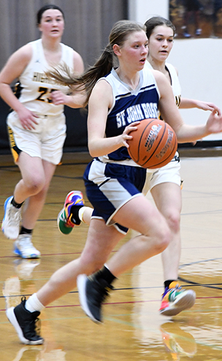 Wassmuth and Noah Beckman were honored with their families. In the game, Logos Online put up much more of a battle than they did in the Patriots first meeting. Still, the Patriots never trailed.Hoene got the scoring started but Logos Online tied it. Levi Wassmuth scored but again the Lions tied it. Beckman then put the Patriots ahead for good with a lay-up at the 4 minute mark. Hoene followed with a hook shot to make it 8-4. Logos got within 1 at 8-7 but Cody Wekcman made to free throws. Twice more Logos got within 1, each time the Patriots answered with Levi Wassmuth scoring a basket and his brother Nathan Wassmuth scoring a free throw as the Patriot led 13-11 at the end of the first quarter. Hoene scored a pair of baskets to open the second quarter. After Logos scored, Beckman and Cody Weckman each scored to make it an 8-point lead at 21-13. Logos got within 4 but 2 free throws by Beckman and a basket by Nathan Wassmuth pushed it back to 8. After a Logos basket, Hoene kicked off a 6-0 run that put the Patriots up by 12. Hoene added another lay-up and Levi Wassmuth scored to make it 31-19. A Logos free throw made it 31-20 at the half. Logos Online got no closer than 7 in the third quarter as Levi Wassmuth scored 4 and Hoene and Rose scored 2 each to keep the Patriots up by at least 7 and as many as 12. Bosco led 39-31 heading into the fourth quarter. Nathan Wasmuth and Cody Weckman each scored to open the fourth quarter. Logos scored 6 straight o pull within 6 at 43-37. Twice more they got within 6 at 45-39 and 47-41 with 3:15 to play. The Patriots then scored 10 straight points to quash any hopes the Lions had of pulling out the win. Levi Wassmuth started the run with a basket. Cody Weckman scored 2 baskets then Levi added 2 more baskets to give the Patriots a 57-41 lead with 1:12 to play. Logos Online scored the final 4 points of the game. Levi Wassmuth had a double-double to lead the Patriots in both scoring and rebounding with 16 points and 12 rebounds. Hone scored 14 while Cody Weckman scored 12. Beckman scored 6, Nathan Wassmuth 5 and Rose 2. Rebounding was even at 43 each. Cody Weckman had a near double-double as he led the team with 9 assists. Levi Wassmuth had 7 steals while Rose had 5. The Patriots were 25 for 59 from the field, 42%, and 5 for 7 at the line, 71%. Logos Online was 19 for 73 from the field, 26%, and 6 for 10 at the line, 60%. The Patriots are now 4-12 on the season and 1-8 in league play. SJB 13 18 8 18 -57 Logos Online 11 9 11 14 -45 SJB-Beckman 2-9, 2-2, 6; Nuxoll 0-2, 0-0, 0; Rose 1-7, 0-0, 2; Hoene 7-17, 0-0, 14; L. Wassmuth 8-11, 0-0, 16; C. Weckman 5-8, 2-3, 12; N. Wassmuth 2-5, 1-2, 5. 3-pointers-none. Logos Online-Landis 8-26, 3-6, 20; S. Harkness 4-23, 1-2, 9; McMurray 1-5, 0-0, 2; C. Harkness 2-6, 0-0, 4; G. Swait 4-13, 2-2, 10; McCabe 0-0, 0-0, 0; Joiner 0-0, 0-0, 0; W. Swait 0-0, 0-0, 0. 3-pointers-Landis. ![]() Julia Wassmuth takes the ball downcourt against Highland. Photo by David Rauzi. ![]() Sarah Waters puts up a shot against Highland. Photo by Steve Wherry. ![]() Miah Mager with the ball against Highland. Photo by David Rauzi. ![]() Noelle Chmelik dribbles the ball against Highland. Photo by Steve Wherry. ![]() Conner Nuxoll drives along the baseline against Highland. Photo by Steve Wherry. ![]() Levi Wassmuth with the ball in the lane against Highland. Photo by David Rauzi. ![]() Stallone Hoene shoots a jumper against Highland. Photo by Steve Wherry. ![]() Julia Wassmuth scores on Senior Night against the Clarkston JV. Also shown is Catherine Seubert. ![]() Sarah Waters sites in a 3-point shot against Clarkston JV. It was her 3-pointer with 6 seconds left that sent the game into overtime. ![]() Julia Wassmuth drives downcourt against the Clarkston JV. ![]() Stallon Hoene goes for a lay-up against Logos Online on Senior Night. ![]() Levi Wassmuth goes for a basket against Logos Online. ST. JOHN BOSCO BOYS AND GIRLS HIGH SCHOOL BASKETBALL SCHEDULES NOVEMBER 21-Girls at C.V., 6 p.m., postponed due to illness at C.V.30-Girls at Logos, 6 p.m., won 26-19 30-Boys vs. Logos Online at Logos gym, 7:30 p.m., won 56-14 DECEMBER 4-Girls, Boys at Salmon River, 6 p.m. MST, girls lost 32-35, boys lost 38-618-Girls, Boys vs. Timberline* at Highland, 5 p.m., girls won 38-26, boys lost 31-60 9-Girls, Boys vs. Nezperce* at Highland, 1 p.m., girls won 32-27, boys lost 47-60 14-Girls, Boys home game vs. Highland* at Highland, 6 p.m., girls won 32-26, boys lost 40-64 15-Girls, Boys at Deary*, 6 p.m., girls lost 25-44, boys lost 40-74 29-30-Girls won 43-7 over Coeur d'Alene Catholic School, boys lost twice JANUARY 6-Girls, Boys vs.Salmon River at Highland, 5 p.m., girls lost by 1, boys won 9-Boys at C.V., 6 p.m., lost 54-63 11-Girls, Boys vs. Kendrick* at Highland, 6 p.m., postponed due to weather 16-Girls, Boys at Timberline*, 6 p.m., girls won 43-17, boys won 45-43 18-Girls, Boys at Nezperce*, 6 p.m., girls lost 32-42, boys lost 59-68 23-Girls, Boys vs. Deary* at Highland, 6 p.m., girls lost 20-47; boys lost 56-63 25-Girls, Boys at Highland*, 6 p.m, girls won 42-29, boys lost 34-58. 26-Girls, Boys vs Kendrick at Highland, 6 p.m., makeup for Jan. 11 postponement, girls lost 24-63, boys lost 22-78 29-Girls vs. Clarkston JV, 6 p.m., Boys vs. Logos Online, Senior Night, 7:30 p.m., girls won 54-51 in OT, boys won 57-45 30-Girls, Boys at Kendrick, 6 p.m., girls lost 19-78, boys lost 33-76, details next week Feb.-Boys to play Clarkston JV or C, home & away, dates and sites to be determined. Feb. 5-Girls play Deary at District at 6 p.m. at Lapwai High School Feb. 7, 9-Girls District continues at Lapwai High School Feb. 15-17-Girls State at Nampa High School Feb. 19-23-Boys District Feb. 29-March 2-Boys State |