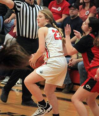 Prairie was held to just 4 points in the second quarter, 2 free throws by Hanson and putback by Elven. However, after Elven’s putback the score was tied at 14-14. Kamiah then scored the final 4 points of the half to take a 14-18 halftime lead. Kamiah scored to open the third quarter. Prairie then got a 3 from Lexi Schumacher, a midrange jumper from Elven and a lay-up from Lexi Schumacher to take their first lead since the score was 6-5. Kamiah then scored 6 straight points to retake the lead. A basket each by Kylie Schumacher and Elven cut the deficit to 25-26 after 3 quarters. Shears put Prairie back on top to open the fourth quarter with a putback. Kamiah answered then Kylie Schumacher made 2 free throws to put Prairie back on top. A 3 by Kamiah’s Karlee Skinner gave the Kubs what turned out to be their final lead of the game. Lexi Schumacher then came up big with back-to-back 3-pointers to give Prairie a 35-31 lead with 5:35 to play. Kamiah’s Emma Krogh then converted a 3-point play to cut the lead to 1. Lexi Schumacher answered with a drive to the hoop. A steal and drive for a lay-up by Kamiah’s Laney Landmark again cut the lead to 1 with 3:27 left. A steal by Elven led to a 3-point play but Landmark answered with a 3-pointer to again cut the lead to 1 with 2:42 left. That turned out to be Kamiah’s final points. Kylie Schumacher made the second of 2 free throws with 2:30 left for a 41-39 lead. A big defensive rebound by Shears led to a lay-up by Kylie Schumacher. Another big defensive rebound, this time by Hanson, led to 2 free throw attempts by Lexi Schumacher with 11 seconds left. She missed both but Elven grabbed the offensive rebound. That led to 2 more free throws by Lexi and this time she made both with 6 seconds left to give Prairie a 6-point lead. That turned out to be the final margin. Lexi Schumacher scored 19 to lead all scorers. Elven added 11 points while Kylie Schumacher scored 9. Hanson scored 4 and Shears scored 2. Elven had a double-double with 11 rebounds as she led Prairie to a 32-24 edge on the boards. Elven also had 6 of Prairie’s 8 steals in the game. Hanson and Geis each had 1. Elven and Lexi Schumacher each had 2 assists. Prairie was 17 for 44 from the field, 39%, and 8 for 13 at the line, 62%. Kamiah was 14 for 40 from the field, 35%, and 4 for 6 at the line, 67%. Kamiah was led in scoring by Landmark, who had 11 points while Skinner had 9 on three 3-pointers. Prairie is now 16-6 on the season and have won 10 straight games and are 10-0 in 2024. Prairie 10 4 11 20 -45 Kamiah 10 8 8 13 -39 Prairie-L. Schumacher 7-16, 2-4, 19; Hanson 1-6, 2-2, 4; Geis 0-1, 0-0, 0; Elven 5-13, 1-3, 11; K. Schumacher 3-6, 3-4, 9; Shears 1-1, 0-0, 2. 3-pointers-L. Schumacher 3. Kamiah-Krogh 3-10, 1-1, 7; Landmark 4-7, 2-2, 11; Porter 1-6, 1-2, 3; K. Skinner 3-7, 0-0, 9; Schoening 2-7, 0-1, 4; Hunt 2-4, 0-0, 5; Loewen 0-0, 0-0, 0. 3-pointers-Skinner 3, Hunt, Landmark. ![]() Erica Schlader looks to pass in the C.V. game. ![]() Halee Rowland with the ball against C.V. ![]() Nadia Cash puts up a shot against C.V. ![]() Sage Elven shoots a lay-up against C.V. Also shown are Halee Rowland and Hailey Hanson. ![]() Alli Geis looks to pass against Kamiah. Also shown is Sage Elven. ![]() Sage Elven looks to shoot against Kamiah. Also shown is Alli Geis. PIRATES GIRLS BASKETBALL SCHEDULE FOR 2023-24