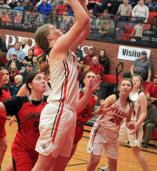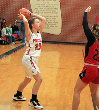 Lexi and Kylie Schumacher each scored 8 points in the opening quarter while Sage Elven scored 6 in the second quarter. Kylie Schumacher opened the second half with 2 free throws to make it 39 straight points. C.V. then made their first basket of the game, a 3-pointer. Prairie scored another 17 straight before C.V. scored again. It was 66-8 heading into the fourth quarter. Prairie outscored C.V. 8-0 in the running clock fourth quarter. Kylie Schumacher wound up with 24 points to lead the Pirates in scoring. Lexi Schumacher scored 16 while Elven scored 12. Sydney Shears added 6 points. Hailey Hanson and Aubree Rehder each scored 5. Alli Geis scored 4. Ellie Nuxoll scored 3 and Nadia Cash scored 1. Prairie had a 49-28 rebounding edge. Kylie Schumacher and Nuxoll each had 9 rebounds to lead the team while Elven had 8 and Shears had 7. Hanson had 5 steals and 6 assists while Lexi Schumacher and Cash each had 4 steals. Elven added 4 assists. Prairie was 34 for 85 from the field, 40%, and 4 for 10 at the line, 40%. C.V. was 3 for 28 from the field, 11%, and 1 for 2 at the line, 50%. Prairie 29 16 21 10 -76 C.V. 1 0 7 0 - 8 Prairie-L. Schumacher 7-13, 0-2, 16; Hanson 2-6, 0-0, 5; Geis 2-2, 0-0, 4; Elven 6-14, 0-0, 12; K. Schumacher 11-21, 2-2, 24; Shears 3-8, 0-2, 6; Nuxoll 1-8, 1-2, 3; Rehder 2-7, 0-0, 5; Cash 0-4, 1-2, 1; Rowland 0-1, 0-0, 0; Schlader 0-0, 0-0, 0. 3-pointers-L. Schumacher 2, Hanson, Rehder. C.V.-Shown 1-4, 0-0, 2; Earl 0-0, 0-0, 0; Wllard 0-3, 1-2, 1; Reuben 1-15, 0-0, 3; Funderburg 1-3, 0-0, 2; Gantes 0-3, 0-0, 0; Lamere 0-0, 0-0, 0. 3-pointers-Reuben. Vs. Kamiah