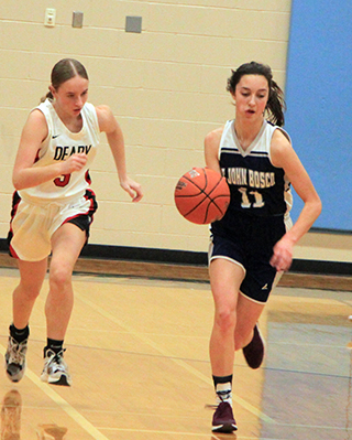 lead with 3 of those coming from 3-point range.Bosco broke the run when Julia Wassmuth mad a basket, Kendrick then scored another 14 straight points before Wassmuth made a free throw. Kendrick scored again to take a 3-31 lead into the second quarter. Kendrick then scored the first 13 points of the second quarter before Wassmuth made another free throw. Kendrick then scored 6 more to take a 4-50 lead at the half. Bosco scored 5 of the first 7 points in the third quarter when Sarah Waters made a lay-up and then hit a 3-pointer to make it 9-52. Kendrick then scored 22 straight points before Wassmuth made a free throw to make it 10-74 at the end of the third quarter. Bosco had their best scoring quarter in the fourth despite the running clock as they almost doubled their score. Wassmuth added 4 more points while Waters and Savannah Perrin each scored a baskets and Noelle Chmelik added a free throw. They outscored Kendrick 9-4 in the final period. Wassmuth scored 9 to lead the Patriots in scoring. Waters added 7 with Perrin scoring 2 and Chmelik 1. Kendrick had a 27-40 rebounding edge. Wassmuth and Waters each had 6 to lead the Patriots. Waters had 2 steals and Perrin had 2 assists. Bosco was 7 for 31 from the field, 23%, and 4 for 8 at the line, 50%. Kendrick was 31 for 66 from the field, 47%, and 6 for 6 at the line. The Lady Patriots finished their regular season with a record of 8-7 overall, 3-5 in league play. SJB 3 1 6 9 -19 Kendrick 31 19 24 4 -78 SJB-Sonnen 0-1, 0-2, 0; Perrin 1-5, 0-0, 2; Wassmuth 3-13, 3-6, 9; Chmelik 0-2, 1-2, 1; Waters 3-8, 0-2, 7; Mager 0-2, 0-0, 0; Seubert 0-0, 0-0, 0. 3-pointers-Waters. Kendrick-H. Heimgartner 3-6, 2-2, 8; Boyer 3-9, 2-2, 8; Silflow 3-6, 0-0, 6; Stewart 9-16, 0-0, 22; Taylor 6-9, 0-0, 17; Kimbley 5-9, 2-2, 12; Anderson 1-2, 0-0, 3; Casto 1-5, 0-0, 2; M. Heimgartner 0-3, 0-0, 0; Kimberling 0-1, 0-0, 0. 3-pointers-Taylor 5, Stewart 4, Anderson. Boys at Kendrick The boys team didn’t fare much better than the girls team at Kendrick.Kendrick opened the game with 20 straight points before Conner Nuxoll put the Patriots on the board with a basket. After a Kendrick 3, Levi Wassmuth scored a putback. After a Kendrick free throw, Stallone Hoene hit a bank shot. Kendrick made 2 free throws then Levi Wassmuth made 3 of 4 attempts to make it 9-26. Kendrick added a 3 to make it 9-29 at the end of the first quarter. Kendrick outscored the Patriots 5-18 in the second quarter to take a 14-47 halftime lead. Levi Wassmuth made 2 free throws while Nathan Wassmuth scored a putback and Cody Weckman made 1 of 2 free throws for the Patriots’ points in the quarter. Kendrick kept up the onslaught in the third quarter hitting 10 of 14 shots while the Patriots got 2 baskets each from Noah Beckman and Nathan Wassmuth and a free throw each from Tommy Rose, Cody Weckman and Levi Wassmuth. Kendrick led 25-67 after 3 quarters. The fourth quarter was played with a running clock. Levi Wassmuth added 2 free throws and the Patriots only 3 pointer of the game. Rose scored a baskets and Hoene made a free throw. Levi Wassmuth wound up as the Patriots leading scorer with 13 points. Younger brother Nathan Wassmuth scored 6 with Beckman scoring 4, Rose and Hoene 3 each, and Nuxoll and Cody Weckman 2 each. Kendrick dominated the boards 22-40. Levi Wassmuth had 9 to lead the Patriots. Sam Weckman had 3 steals and Cody Weckman had 3 assists. The Patriots were 10 for 42 from the field, 24%, and 12 for 20 at the line, 60%. Kendrick was 34 for 63 from the field, 54%, and 4 for 6 at the line, 67%. The Patriots are now 4-13 on the season and finish league play with a 1-9 record. They are looking at scheduling a couple more games with the Clarkston JV or C teams but no dates have been set yet. SJB 9 5 11 8 -33 Kendrick 29 18 20 9 -76 SJB-Beckman 2-5, 0-0, 4; Rose 1-3, 1-2, 3; Hoene 1-6, 1-2, 3; C. Weckman 0-2, 2-4, 2; L. Wassmuth 2-11, 8-10, 13; Nuxoll 1-3, 0-0, 2; N. Wassmuth 3-5, 0-0, 6; S. Weckman 0-6, 0-2, 0. 3-pointers-L. Wassmuth. Kendrick-Roetcisoender 8 0-0 17, Tweit 11 2-2 28, Cook 3 0-0 6, Kimberling 1 1-2 3, T. Koepp 2 0-0 4, Silflow 3 0-0 7, Morgan 1 0-0 2, K. Koepp 1 0-0 2, Kirkland 1 0-0 2, Lewis 2 1-2 5. 3-pointers-Tweit 4, Roetcisoender, Silflow. Girls vs. Deary at District The Lady Patriots couldn’t get any offense going against Deary in their District Tournament opener Monday, Feb. 5They went 0 for 5 from the field in the first quarter as Deary took a 0-9 lead into the second quarter. The Mustangs extended the lead to 18-0 before Chmelik finally put Bosco into the scoring column with a short shot in the lane on an inbounds play. Chmelik added 2 more baskets in the quarter as Deary took a 6-22 lead at the half. Deary went up 6-26 in the third quarter before Julia Wassmuth scored on a feed from Chmelik. Deary then scored 9 straight points before Chmelik scored again. Deary led 10-37 headed into the fourth quarter. Vivian Dahlsrud scored to open the fourth quarter however Deary scored a basket and a 3 to go up 30 and invoke the running clock. Bosco didn’t score again until Chmelik scored on a lay-up with 2:10 to play. That turned out to be the final points of the game. Chmelik wound up with 10 of St. John Bosco’s 14 points in the game. Dahlsrud and Wassmuth scored 2 each. Deary was led by Kenadie Kirk, who scored 19 points. Bosco competed well on the boards, outrebounding the Mustangs 37-30. Perrin and Rachel Sonnen each had 7 rebounds to lead the Patriots while Dahlsrud and Chmelik had 6 each. Wassmuth had 6 steals and 2 assists. Bosco was 7 for 32 from the field, 22%, and 0 for 3 at the line. Deary was 18 for 57 from the field, 32%, and 7 for 9 at the line, 78%. The Patriots will play Nezperce in a loser out game Wednesday, Feb. 7 at 6 p.m. at Lapwai High School. The winner will play the Kendrick-Deary loser on Friday at 6 p.m. for second place and a berth in the state tournament. St. John Bosco is now 8-8 on the season. SJB 0 6 4 4 -14 Deary 9 13 15 9 -46 SJB-Dahlsrud