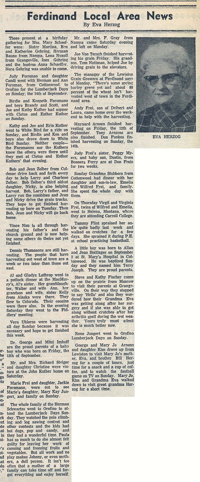 The Ferdinand Local Area News column from Sept. 25, 1975, which includes a photo of Eva Herzog. Click on
