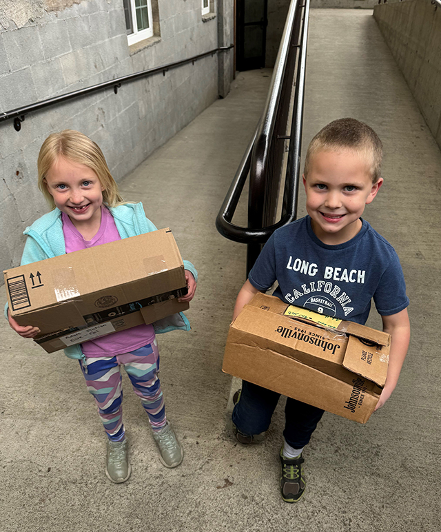 Aubree Westhoff and Gus Terhaar were a great help Saturday, May 4 in moving books back into the library. Submitted photo. Click on the photo for a larger view.