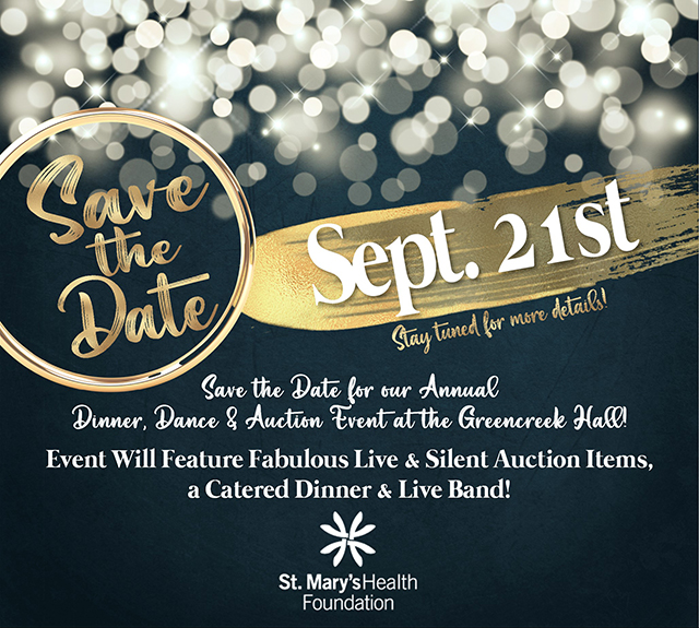 save the date and plan to join us for this exciting new event. This past spring we were unable to hold our annual Mardi Gras event due to flooding at the venue, so the St. Mary’s Foundation Board decided to do something different this year. We will have more details to share with you in the coming months, but some of the changes include moving our event to the Greencreek Hall on Sept. 21, where we will have a catered dinner, live and silent auctions, and live band to dance the night away. Please mark your calendars for this fun and important event – it will be a big day to help make a big difference. ![]() |