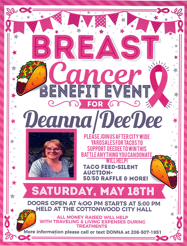 There will be a breast cancer benefit event for Deanna/DeeDee this Saturday, May 18. It will be a taco feed, silent auction, 50/50 raffle and more and will be. at Cottonwood Community Hall. The doors will open at 4 p.m. and the event will start at 5. All money raised will help with traveling and living expenses during treatments. For more information call or text Donna at 208-507-1951. ![]() |