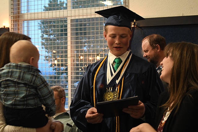 announced. Levi Wassmuth earned medals for 4 years of basketball, 4 years of drama, 4 years of academic bowl, 1 year of student government, 2 years of gun club, 80 hours of Apostolic Service. He received a $2,000 Scholarship from the Idaho County Farm Bureau. He was awarded the Patriot Award and Excelsior Award which are determined by faculty. Dustin Kaschmitter earned medals for 2 years of basketball, 4 years of drama, 4 years of academic bowl, 2 year of student government, 4 years of gun club, 80 hours of Apostolic Service. He was awarded the Lewis Clark State College Presidential Scholarship in the amount of $2500, renewable for 4 years for a total amount of $10,000. Maleah Cummings received medals for 1 year of basketball, 2 years of drama, 2 years of academic bowl, 1 year of student government, 2 years of volleyball, 1 year of gun club and 40 hours of Apostolic Service. She was awarded the Benedictine College Saint Scholastica Scholarship for $19,000, renewable for 4 years and All Saints Parish Essay Scholarship for $500. Noah Beckman earned medals for 2 years of basketball, 4 years of drama, 4 years of academic bowl, 3 years of gun club, 80 hours of Apostolic Service. Stallone Hoene received medals for 4 years of basketball, 4 years of drama, 4 years of academic bowl, 2 years of student government, 2 years of gun club, 80 hours of Apostolic Service. He earned the Vandal Merit New Academic Achievement Scholarship for $1200. Elijah Rauzi earned medals for 1 year of basketball, 3 years of drama, 1 year of academic bowl, 2 years of student government, 60 hours of Apostolic Service. He was awarded the St. John Bosco Award from faculty. Trent Walker earned medals for 2 years of gun club, 80 hours of Apostolic Service. ![]() ![]() A couple of photos courtesy of David Rauzi of the Idaho County Free Press of graduates receiving congratulations at the reception in the gym following graduation. Top photo is Noah Beckman while the lower photo shows Maleah Cummings. |