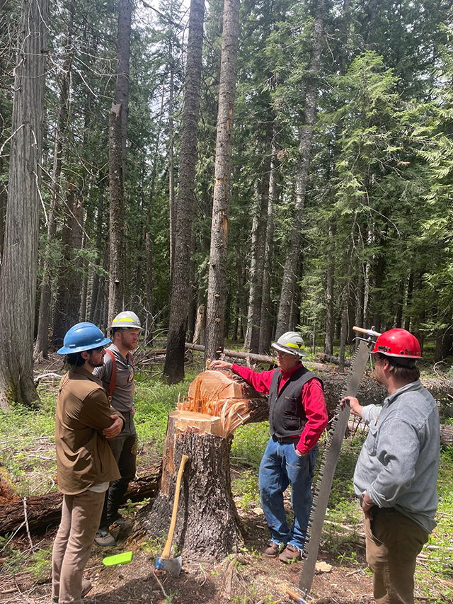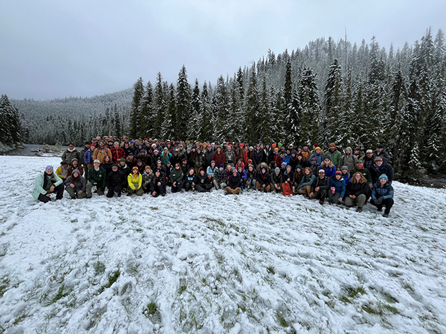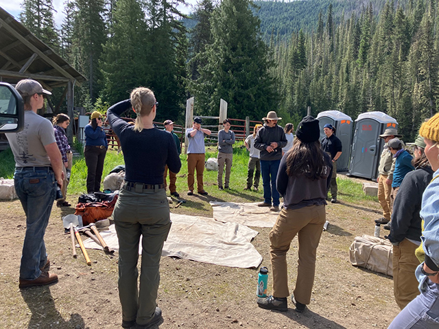 Participants in trainings included field going partners, members of the Nez Perce Tribal Cultural Resource program, and National Park Service and Forest Service staff. Among the partner organizations represented were Montana Conservation Corps, the Selway-Bitterroot Frank Church Foundation, the Great Burn Conservation Alliance, Friends of Scotchman Peaks Wilderness, Backcountry Horsemen, the Absaroka-Beartooth Foundation, and the Bob Marshall Wilderness Foundation. Over the course of the week, students ate together, built trail together, made music together, and built relationships between partners and staff to unite in their mission. Chris Noyes, Deputy District Ranger for the Lochsa-Powell Ranger District saw more than just learning and camaraderie and felt that it represented “a return to why this district was created in the first place: an outpost in the wilderness.” In addition to on-the-ground experiential classes in basic and advanced trail maintenance, crosscut saw skills, and horsemanship, attendees also studied field leadership skills and the practices and theory of wilderness management. One instructor was Mark Himmel, national chairman of Backcountry Horsemen of America, who has been helping to instruct classes for three years. Himmel explained that this training “makes an impact on the next generation by getting the participants the skills they need to have a career in the wilderness. Working with traditional tools puts you in a different spirit. It’s important to get that spark lit.” For Brenda Yankoviak, National Trails Program Manager for the Forest Service, the week of classes was not just “an investment in field going staff and partners to keep skills alive and build community,” it was also a homecoming, to the district where her decades of Forest Service experience began. Bob Beckley, a technical expert in wilderness skills and former smokejumper on the Moose Creek Ranger District, explained how the institute represented a change in mindset from his early years when “my mentors thought it was strange that I wanted to learn crosscut instead of chainsaw.” He lamented how many traditional skills were lost from that mindset but, “This is where we can reinvent the wheel” so that traditional skills are sustained into the future. Participants seemed to share the sentiment. Erynn Castellanos, Education Partnership Specialist with the Bob Marshall Wilderness Foundation, said: “It’s great to connect with our partners and friends we can’t connect with during the field season. This is our first year here and what partners gain from this institute is what inspired us to join.” Ian Harris of the Selway-Bitterroot Frank Church Foundation extolled “The commonality of the wilderness mindset and folks sharing and learning together.” Mid-week, students woke up to snowy tents from late spring storms, but that didn’t stop their spirit. They got out and took to the trails, where they put their newfound skills to work, clearing trails, practicing horsemanship, and thinking about how to steward wilderness. Despite full days, participants partook in additional evening programs meant to engage their artistic senses. Collage artist, Jennifer Ogden, from the Bitterroot Valley shared how nature inspires her creations and led the group in a short journal making workshop. On another evening, participants attended a talk from local legend Jim Renshaw, a former Moose Creek outfitter whose lifelong relationship with the Selway began when he was only 2 months old, who shared stories about the nearby wilderness area that predated passage of the 1964 Wilderness Act. On the last evening, the group closed out the week with a concert by The Pack Strings, a Missoula band that plays acoustic roots and folk music comprised of former and present Forest Service wilderness employees.. As the attendees head out to work in wilderness areas throughout the Northern Rockies and beyond this summer, they will take the skills, spirit, and knowledge they gained during the week’s training with them. And for wilderness visitors, their hard work will enable a future generation of stewards to enjoy their time in some of America’s wildest places. ![]() A group photo of all the participants. USFS photo. ![]() Students in the Defensive Horsemanship class learn and practice packing loads for stock supported trips. USFS photo. ![]() Students pose after practicing trail maintenance. USFS photo. ![]() Students in the Advanced Crosscut Saw class showing off a tree they felled. USFS photo. |