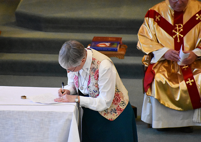 Benedictine Sister Mary Frances Kluss signs her profession document on the altar during her 50th jubilee celebration on June 24 in the chapel at the Center for Benedictine Life at the Monastery of St. Gertrude, Cottonwood.  Photo provided by Monastery of St. Gertrude.