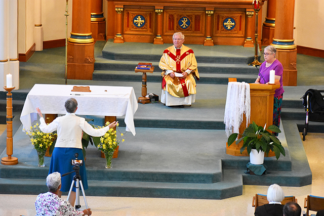 Benedictine Sister Mary Frances Kluss (left) sings the “Suscipe” before the altar as Father Gerald Funke and prioress Sister Teresa Jackson watch, during her 50th jubilee celebration on June 24 in the chapel at the Center for Benedictine Life at the Monastery of St. Gertrude, Cottonwood. Photo submitted by Monastery of St. Gertrude.