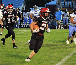 was returned to the 20.On first down Briggs Rambo tackled the Lapwai runner for a 2 yard loss. On second down Lapwai gained just 1 yard. On third down Schumacher sacked McCormack for an 11 yard loss leading to a punt from the 8. The punt went just 22 yards with Prairie taking over at the Lapwai 30. Prairie needed 6 plays to score again. McElroy gained 8 and Gehring went for 2 for a first down. McElroy passed to Wemhoff for 9 yards and Schumacher went for 2 for first and goal at the 9. McElroy gained 4 on a keeper to the right and then Gehring scored on a power run up the middle where he carried a couple of defenders into the end zone. McElroy passed to Gehring for the 2-pointer to make it 54-8. That invoked the running clock mercy rule for the rest of the game. Lapwai took over at their own 42 and faced third on a11 from the 41. McCormack’s pass to the left side was intercepted by Schwartz at the 48 and he took the ball to the end zone for a touchdown. McElroy passed to Wemhoff for the 2-pointer and a 62-8 lead. Graham-Pile’s line drive kickoff hit a Lapwai player and bounced to Gehring who recovered the ball at the Lapwai 46. A 13 yard run by Schumacher moved the ball to the 32. An 8-yard pass to Schumacher on fourth and 3 gave Prairie a first down at the 17. After a 1 yard run by McElroy, Gehring took the ball to the left side and all the way to the end zone. The 2-point pass attempt fell incomplete as Prairie now led 68-8. The subs went in on defense and Lapwai was able to move the ball downfield for a touchdown. They covered 56 yards in 6 plays. The 2-point try failed, making it 68-14. Prairie took over at their own 45 after an onside kick try with Kade Quintal recovering. The second unit faced third and 15 when Kade Quintal completed a pass to Trajan Elven for 18 yards and a first down. Prairie then ran out the clock. The Pirates gained 190 yards rushing on 41 attempts. Gehring led the way with 102 yards on 14 carries. McElroy added 47 on 13 carries and Schumacher 32 yards on 10 carries. Dylan Uhlenkott missed the game due to concussion symptoms. McElroy completed 6 of 8 passes for 197 yards while Quintal was 1 for 1 for 18 yards. Wemhoff caught 3 passes for 94 yards. Schumacher caught 2 for 78. Schwartz caught 1 for 25 and Elven caught 1 for 18. Defensively Rambo had 5 solo tackles. Wemhoff had 4 solo tackles, 1 assist and 3 sacks. Gehring had 4 assists, 1 sack and an onside kick recovery. Schumacher had 3 solo tackles, 3 assists and 1 sack. Schwartz had 1 assist and and interception that he returned for a touchdown. Jake Quintal had 2 tackles and 1 assist. Kade Quintal had 2 solo tackles. Carter Shears had 1 solo tackle and 1 assist. Lane Mader and Elven each had 2 assists. Zach Schumacher had 1 solo tackle and Graham-Pile had 1 assist. Prairie is now 2-1 on the season and 1-0 in league play. Their next game is Homecoming against Kamiah this Friday, Sept. 20. Prairie 14 24 24 6 -68 Lapwai 0 0 8 6 -14 P-Wemhoff 13 pass from McElroy (run failed) 3:10 1st P-Gehring 32 run (Gehring run) 1:59 1st P-Schumacher 3 run (Schumacher pass from McElory) 11:06 2nd P-McElroy 6 run (Schumacher run) 7:33 2nd P-Schumacher 70 pass from McElroy (Schwartz pass from McElroy) 2:55 2nd L-McCormack 12 run (Noriega pass from McCormack) 11:12 3rd P-Wemhoff 72 pass from McElroy (Gehring run) 9:43 3rdc P-Gehring 5 run (Gehring pass from McElroy) 5:37 3rd P-Schwartz 48 interception return (Wemhoff pass from McElroy) 1:55 3rd P-Gehring 16 run (pass failed) 7:38 4th L-Barros 7 run (pass failed) 3:00 4th ![]() Phil Schwartz races down the far sideline for a touchdown after intercepting a Lapwai pass. ![]() Levi Gehring fought his way through two Lapwai defenders into the end zone for a touchdown. ![]() Matt Wemhoff records one of his 3 sacks of the Lapwai quarterback. Also shown are jake Quintal and Carter Shears. ![]() Briggs Rambo tackles a Lapwai ballcarrier for a loss. Also shown are Chris Schumacher, Jake Quintal and Levi Gehring. ![]() Quarterback Levi McElroy has evaded a would-be tackler and looks to pass . ![]() Matt Wemhoff crosses the goal line with the first touchdown of the game for the Pirates. ![]() Levi Gehring gets into the open field and gained 32 yards on this run. Also shown is Matt Wemhoff. PIRATES BOYS FOOTBALL SCHEDULE FOR 2024