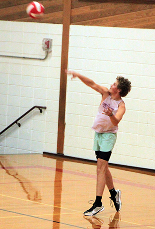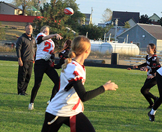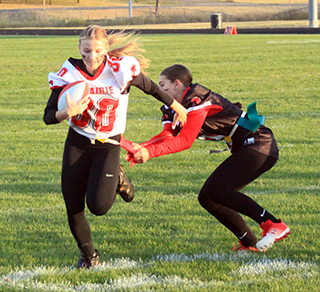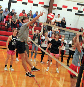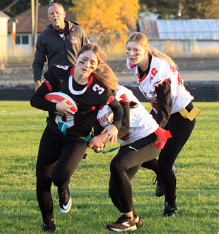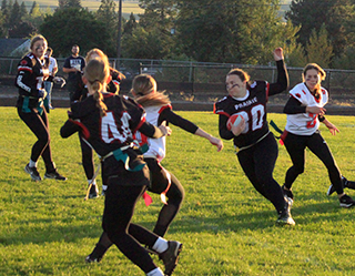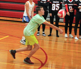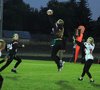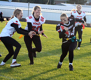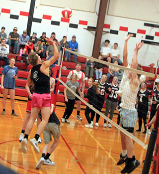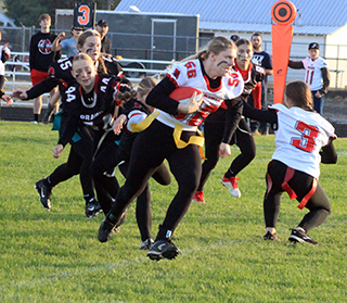 The Junior-Sophomore team dominated the Powderpuff Football game Wednesday, Sept. 18 during Homecoming Week as they won 26-0. Juniors Sage Elven and Avery Riener hooked up for the game’s first touchdown with Riener catching a pass from Elven. The Jr.-Soph. team struck again in the first quarter with Elven passing to Nadia Cash for a touchdown. In the second quarter Elven passed to Sierra Oliver for another touchdown they added the 2-point conversion and led 20-0 at the half. There was no scoring in the third quarter as the Senior-Freshman team adjusted on defense. The only scoring of the second half came on an 85 yard interception return for a touchdown by Elven in the final seconds when it appeared the Sr.-Fr. Team might finally get on the scoreboard. The action then moved from the football field to the Elementary gym where the boys held a volleyball tournament. The senior beat the freshmen 15-6 in the opening match while the juniors beat the sophomore, also by 15-6. In an elimination match the sophomores edged the freshmen 15-12. The seniors then rallied from a 13-9 deficit to win 15-13 on the strength of Dylan Uhlenkott’s serving. The juniors then eliminated the sophomores 15-7. The juniors then needed to beat the seniors twice to claim the powderpuff volleyball title. The juniors dominated the first set winning 15-4. In the winner-take-all match the juniors held on for a 15-11 win ![]() Aubree Rehder is tackled by an unidentified jr.-soph player. Also shown is Kylie Schumacher. ![]() Kaylie Lockett carries the ball for the Sr.-Fr. team ![]() Kenly Forsmann pulls the flag from Sierra Oliver. ![]() Kylie Schumacher carries the ball for the Jr.-Soph. team. Mia Anderson reaches for Kylie's flag. Behind Mia is Macie Uhlenkott. ![]() Lexi Schumacher laps to make a catch for the Sr.-Fr. team. ![]() Mia Anderson carries the ball with Avery Riener and Kylie Schumacher closing in on her. Sage Elven is in the background. ![]() Sage Elven passes the ball for the Jr.-Soph. team. She had a hand in all 4 touchdowns scored, throwing 3 TD passes and scoring the final touchdown on an interception return. In the foreground is Avery Riener. ![]() Levi Gehring goes up to hit the ball in teh powderpuff volleyball game. Matt Wemhoff attempts to block. ![]() Logan Weber had a big serving run to help the seniors open with a win over the freshmen. ![]() Matthew Jones for the freshman team. ![]() Nate Forsmann serves for the winning junior team. ![]() Riley Shears hits the ball over for the junior team. |