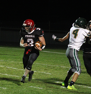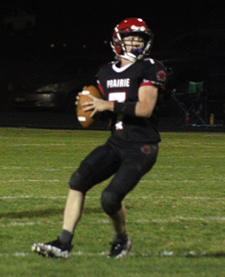 8:38 to play.Potlatch answered back with a 10 play drive that covered 55 yards. Marshall scored on a 1 yard run. The 2-point pass failed, making it 38-26. Potlatch then tried an onside kick that went off a Prairie player and was recovered by the Loggers at their own 48. They converted on third and 10 twice with pass completions of 21 and 12 yards. After a 4 yard run, a 13 yard completion set up first and goal at the 2. Marshall was stopped on first down for no gain but scored on the next play. Phil Schwartz knocked down the 2-point pass leaving Prairie with a 38-32 lead with 1:52 to play. Briggs Rambo recovered Potlatch’s onside kick attempt at the 50. On third and 7 at the Potlatch 47, Uhlenkott broke through the middle and went 47 yards for a Prairie touchdown. McElroy passed to Wemhoff for the 2-pointer for a 46-32 lead. Gehring then squibbed the kickoff and it banged off a Potlatch player and Wemhoff recovered at the Potlatch 46. Prairie was then able to run out the clock. Uhlenkott picked up his 350 yards on 26 carries. McElroy added 75 yards on 19 carries as Prairie rolled up 431 yards rushing on 55 attempts. It was good they had a strong running game as McElroy completed just 2 of 11 passes with 2 interceptions for 19 yards. Schumacher had 1 catch for 13 yards and Gehring had 1 catch for 6 yards. Potlatch had 70 yards rushing on 39 attempts led by Hunter Redmon who had 45 yards on 11 carries. Marshall completed 10 of 18 passes for 310 yards. Johnson caught 4 for 146 and Magallon caught 4 for 111. Defensively Uhlenkott had 11 tackles and 2 assists. Wemhoff had 8 tackles, 3 assists, ½ a sack and 1 onside kick recovery. Quintal had 5 tackles, 4 assists, 1 ½ sacks and 1 catch of a blocked punt for a touchdown. Gehring had 4 tackles and 1 fumble recovery. Schumacher had 4 tackles and 1 assist. Shears had 2 tackles and 2 assists while Schwartz had 2 tackles. Prairie is now 5-2 on the season and 4-1 in league, good for third place. That puts them in really good shape for a state playoff berth. This week they will play at Troy on Friday, Oct. 18 at 7 p.m. Prairie 8 14 8 16 -46 Potlatch 8 6 6 12 -32 Po-Johnson 64 pass from Marshall (Marshall run) 11:05 1st Pr-Uhlenkott 19 run (Uhlenkott run) 0:06.9 1st Po-Johnson 48 pass from Marshall (pass failed) 10:35 2nd Pr-Uhlenkott 75 run (pass failed) 7:22 2nd Pr-Quintal recover of blocked punt in end zone (Uhlenkott run) 0:23.8 2nd Po-Magallon 52 pass from Marshall (run failed) 9:30 3rd Pr-Uhlenkott 46 run (Wemhoff pass from McElroy) 6:19 3rd Pr-Schumacher 2 run (Uhlenkott run) 8:38 4th Po-Marshall 1 run (pass failed) 4:15 4th Po-Marshall 2 run (pass failed) 1:52 4th Pr-Uhlenkott 47 run (Wemhoff pass from McElroy) 0:55.7 4th ![]() Dylan Uhlenkott took off with a fake punt on fourth and 30 and not only converted a first down but went 75 yards for a touchdown. Trailing the play is Briggs Rambo. ![]() Levi McElroy looks pass against Potlatch. ![]() Matt Wemhoff and Dylan Uhlenkott combine to tackle a Potlatch runner. ![]() Dylan Uhlenkott runs past a block by Chris Schumacher and heads for the first of his 4 touchdowns against Potlatch. PIRATES BOYS FOOTBALL SCHEDULE FOR 2024