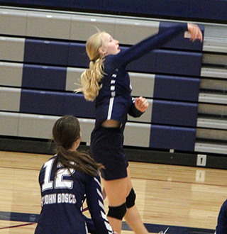 lead with an ace and a kill each by Savannah Perrin and Rachel Sonnen.![]() After a sideout by C.V., Wassmuth scored a kill for a 4-1 lead. A kill each by Wassmuth and Perrin had the Patriots up 6-2. They held the lead at 3 or 4 points until C.V. had a 1-4 rally to tie the score at 15. Bosco trailed for the first time at 17-18. Bosco tied it then C.V. took the lead for good. In the second game C.V. bricked the opening serve for a 1-0 Bosco lead. That turned out to be their only lead of the game. C.V. took a 3-9 lead and Bosco was able to rally back to tie it at 13-13 after 3 aces by Presley Schoo. C.V. then scored a sideout to retake the lead and scored 5 more for a 13-19 lead. Bosco managed to get back within 1 late in the set after a kill by Perrin and an ace by Chmelik made it 22-23. A missed spike scored a sideout for C.V. then Schoo scored a kill to make it 23-24. C.V. then scored to win the set. In the third set Chmelik served Bosco to a 4-0 lead with 2 aces plus a kill each by Wassmuth and Perrin. C.V. came right back to tie it at 4-4 before missing a serve. C.V. then scored built at 7-10 lead. They led 11-14 when they bricked a serve for a sideout. Chmelik then had another serving run with 4 aces plus a kill by Wassmuth as Bosco took the lead back at 16-14. After a sideout, Catherine Seubert scored a kill to send Sonnen to the service line. She served Bosco to a 21-15 lead with 2 aces plus a pair of kills by Wassmuth. An ace by Schoo got Bosco to set point. A double hit call scored a sideout then C.V. bricked a serve to give Bosco the set. Bosco was unable to take any momentum into the fourth set though as they never led. A kill by Chmelik tied it at 1-1 and a kill by Sonnen tied it at 2-2. They tied it again at 3 on a missed C.V. serve and at 6-6 after a kill by Perrin. C.V. then took the lead on a net violation by Bosco and scored 8 straight points for a 6-15 lead. They went on to win by 10 to win the match. Perrin had 15 kills to lead the team with 2 assists and 2 aces. Wassmuth had 11 kills, 6 assists and 2 aces. Schoo had 6 kills and 4 aces. Chmelik had 4 kills, 20 assists and 9 aces with her jump serve. Sonnen had 2 kills and 2 aces. Seubert had 2 kill and 1 assist. CeCe Remacle had 3 assists and Miah Mager had 2 assists. They are now 5-4 in league play with a match against Genesee yet to play, and 7-7 overall. Bosco won the JV match 25-23, 25-21. In the first set the trailed most of the game. Except for a couple of brief leads, they trailed until Schoo scored a sideout kill at 19-22 that sent Remacle to the service line. She served 2 aces then Sarah Waters scored a back row kill. 2 more aces got the Patriots to set points at 24-22. C.V. scored a sideout then Catherine Beckman picked up a kill on a free ball to give the Patriots the set. In the second set Bosco took their first lead on an ace by Beckman and then Seubert added a kill to make it 4-2. A kill each by Madeline Wassmuth, Waters and Remacle made it 7-3. Except for a tie at 15-15, Bosco held the lead until a 4-point run by C.V. gave them a 19-21 lead. Schoo then scored a sideout kill and Remacle went back to serve. A kill by Seubert was followed by an ace from Remacle. After a net violation by C.V., Madeline Wassmuth scored a kill and then Remacle served an ace for the match winner. ![]() Catherine Seubert spikes the ball against C.V. at the Angelus Center. Also shown is Savannah Perrin. ![]() Julia Wassmuth serves against C.V. ![]() Miah Mager makes a pass against C.V. Also shown is CeCe Remacle. ![]() Noelle Chmelik has developed an effective jump serve. Her coach and older sister Jamie Johnson looks on. ![]() Savannah Perrin digs a serve agaisnt C.V. Also shown are Miah Mager and Julia Wassmuth. Patriots Volleyball schedule for 2024