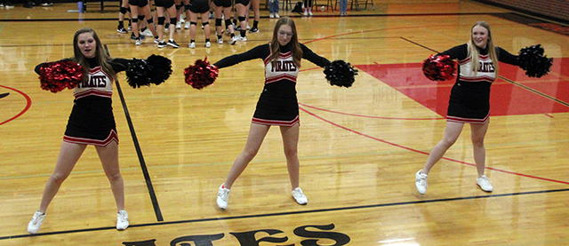 The Prairie cheerleaders performed between sets at the volleyball senior night as the PHS pep band played the fight song.