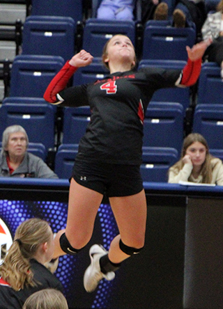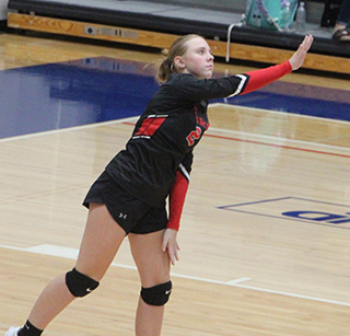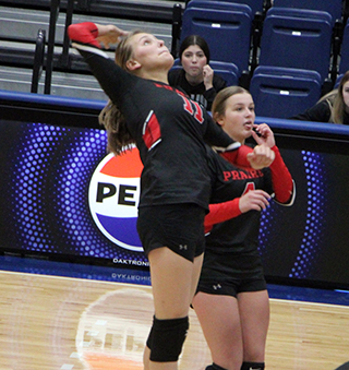 first point on a kill by Kylie Schumacher, then fell behind 1-4.After a missed Potlatch serve, Lockett served Prairie back into the lead. She had 1 ace while Lexi Schumacher scored 3 kills to make it 6-4. After 4 straight sideouts, Anderson served 2 aces to make it 10-6. At 11-9, Potlatch bricked a serve and Nuxoll served Prairie to a 16-9 lead with 2 aces plus 2 kills by Kylie Schumacher. Potlatch got within 6 at 19-13 then missed a serve. Lockett served 2 aces and Hanson scored on a block to make it 23-13. After 2 points by Potlatch, Lexi Schumacher scored a kill to get to set point. After a Potlatch sideout, Lexi added another kill to win the set. Prairie started the second set with 2 kills by Kylie Schumacher. Potlatch tied it at 2, 3 and 4, but couldn’t take the lead. At 4-4 Lexi Schumacher scored back to back kills. Nuxoll scored a block and Kylie Schumacher scored a kill for an 8-4 lead. Potlatch was able to rally within 1 at 12-11 but a kill by Hanson and an ace by Lockett made it 14-11. At 15-13, Shears scored a kill and 2 kills by Lexi Schumacher and an ace by Anderson made it 19-13. Potlatch got back within 2 at 20-18 but a sideout kill by Kylie Schumacher and 2 aces by Nuxoll made it 23-18. After a sideout, Hanson scored a kill to get to set point. Potlatch scored a sideout but then Hanson scored on a block to give Prairie a 2 sets to 0 lead. The first time in 3 matches against the Loggers that Prairie had won more than 1 set. In the third set Potlatch was able to take a lead at 3-4 but a kill by Lexi Schumacher and a block and a kill by Nuxoll made it 6-4. Potlatch tied it at 6 and again at 7 but Prairie then built a 13-9 lead after 2 aces by Pecarovich. Potlatch then rallied back with 8 straight points to take a 13-17 lead before missing a serve. Lockett served an ace but a double hit scored a sideout. 2 kills by Lexi Schumacher 2 aces by Hanson put Prairie back on top at 19-18. Potlatch then took back the lead at 19-21. A kill each by Shears and Lexi Schumacher tied it. Potlatch scored a sideout kill to take what would be their final lead at 21-22. Lexi Schumacher then scored a sideout kill to tie it and went to the service line. Kylie Schumacher and Anderson each scored a kill to get to match point. Kylie Schumacher then scored the match winning kill to send Prairie into a celebration and to the state tournament. Lexi Schumacher had 20 kills and 1 assist in the match. Kylie Schumacher had 14 kills. Hanson had 9 kills, including 3 blocks, with 1 assist and 2 aces. Nuxoll had 3 kills, including 2 blocks and 4 aces. Shears had 2 kills and an assist. Pecarovich had 1 kill, 18 assists and 4 aces. Anderson had 1 kill, 18 assists and 3 aces. Oliver had 1 kill and 2 assists. Lockett had 5 aces. Schwartz had 1 assist. Prairie takes a 17-12 record into the state tournament. ![]() Lexi Schumacher winds up for a spike against C.V. at District. ![]() Lacey Schwartz makes a pass against C.V. at District. Also shown are Kaylie Lockett and Sydney Shears. ![]() Tamden Pecarovich twice opened sets at District by serving 10 straight points. Here she is serving against C.V. ![]() Sydney Shears goes for a spike against C.V. Also shown is Tamden Pecarovich. ![]() Ellie Nuxoll goes for a spike against Potlatch at District. Also shown is Lexi Schumacher. ![]() Mia Anderson serves against Potlatch. JV games start at 6, followed by Varsity unless indicated