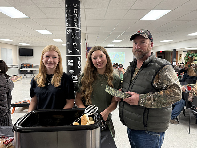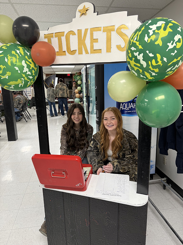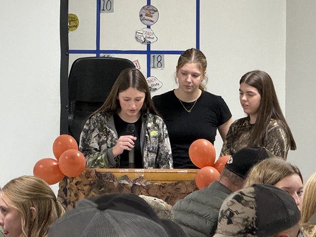 Lillian Rehder and Noelle Uhlenkott take tickets at Daddy Date Night. Aubree Rehder, Kylie Schumacher and Harlee Brannan at the podium.
