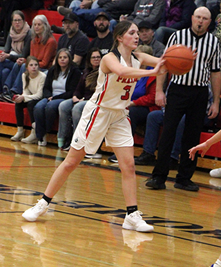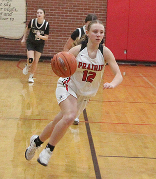 Orofino finally got on the board at the 4:57 mark of the quarter. Elven and Lexi Schumacher each scored again to make it 18-2. After a basket by Orofino, Elven scored on a putback and Kylie Schumacher scored 2 baskets to make it 24-4. After another Orofino basket, Prairie closed out the first quarter with an 8-0 run. Elven scored the first 4 then Ellie Nuxoll scored a putback. Kylie Schumacher closed out the quarter with a pair of free throws to make it 32-6. Kylie opened the second quarter with a basket then Orofino put their first back-to-back scores together to make it 34-10. Prairie then scored 7 straight on a basket by Elven and a basket and 3-point play by Lexi Schumacher. Orofino then scored 5 straight points before Elven closed out the half with a lay-up to make it 43-15 at the break. Prairie outscored Orofino 29-4 in the third quarter. They opened the second half with a 6-0 run with Elven scoring 2 baskets and Kylie Schumacher 2 free throws. After an Orofino basket Prairie scored 10 straight points. Elven had 2 baskets and 2 free throws and Kylie Schumacher scored 2 baskets. After another Orofino score, Prairie closed out the third quarter with a 13-0 run. Lexi Schumacher scored a lay-up. Kylie Schumacher scored 2 baskets. Mia Anderson stole the ball and scored a lay-up. Kylie Schumacher added a lay-up and Hanson closed out the quarter with a 3-pointer. That made it 72-19 after 3 quarters. The fourth quarter was played with a running clock. Nadia Cash opened the quarter with a basket then Orofino scored 4 straight points. Prairie then closed out the game with a 5 straight points. Cash scored a free throw and Kylie Schumacher and Erica Schlader each added a basket. Elven led all scorers with 28 points as she made 13 of 16 shots and was 2 for 2 at the line. Kylie Schumacher added 25 points as she was 10 for 18 from the field and 5 for 5 at the line. Lexi Schumacher scored 14. Hanson and Cash scored 3 each and Nuxoll, Schlader and Anderson scored 2 each. Elven had a double-double as she had 11 rebounds to lead Prairie to a 33-22 edge on the boards. Kylie Schumacher approached triple-double status as she had 8 rebounds and 9 steals. Sydney Shears added 7 steals and Hanson had 4 assists. Elven and Kylie Schumacher each had 3 assists. Prairie was 34 for 66 from the field, 52%, and 9 for 14 at the line, 64%. Orofino was 11 for 26 from the field, 42%, and 1 for 4 at the line, 25%. The JV game was just as lopsided as the varsity as Prairie won 43-13. Prairie led 17-0 at the end of the first quarter and were up 23-0 in the second before Orofino got on the scoreboard. Anderson scored 6 points in the opening quarter while Beka Schumacher scored 5 and Reagan Brannan scored 4. Schlader scored the other 2 points. Orofino got on the scoreboard with a free throw at the 5:39 mark in the second quarter and added another free throw at the 2:58 mark. Those were their only points of the first half. Schumacher added 8 points in the second quarter while Brannan, Mikayla Rowland and Blake Uhlenkott each scored 2 as Prairie led 30-2 at the half. Prairie scored the first 9 points of the second half before Orofino finally scored a basket as they hit a 3-pointer at the 3:20 mark of the third quarter. Anderson opened the second half scoring wit a basket. Schumacher added a putback. Schlader scored on a drive and then on a pitchback and Schumacher added a free throw to make it 39-2. After the Orofino 3, Anderson and Schlader each scored a baskets to make it 43-5. Orofino scored again to make it 43-7 after 3 quarters. The fourth quarter was played under a running clock and Orofino outscored Prairie 0-6 in the final period. Schumacher had a double-double with 15 points and 10 rebounds to lead both categories. Anderson added 10 points while Schlader scored 8, Brannan 6 and Rowland and Uhlenkott 2 each. Prairie had a 48-38 advantage on the boards. Brannan added 7 rebounds and Rowland 6. Kenly Forsmann had 9 steals while Brannan had 8 and Anderson 7. Brannan led in assists with 2. The JVs were 20 for 77 from the field, 26%, and 3 for 11 at the line, 27%. Orofino was 5 for 29 from the field, 17%, and 2 for 7 at the line, 28%. Prairie 32 11 29 7 -79 Orofino 6 9 4 4 -23 Prairie-L. Schumacher 7-14, 1-3, 14; Shears 0-3, 0-2, 0; Hanson 1-2, 0-0, 3; Elven 13-16, 2-2, 28; K. Schumacher 10-18, 5-5, 25; Cash 1-2, 1-2, 3; Nuxoll 1-4, 0-0, 2; Rehder 0-3, 0-0, 0; Schlader 1-2, 0-0, 2; Anderson 1-1, 0-2, 2; Kalmbach 0-1, 0-0, 0. 3-pointers-L. Schumacher, Hanson. Orofino-Tondevold 1-6, 0-0, 2; E. Beardin1-2, 0-0, 2; Johnson 1-6, 0-0, 2; Curtis 1-1, 0-2, 2; Diffin 6-8, 1-3, 13; Olive 1-3, 0-0, 2; Waters 0-0, 0-0, 0; Deyo 0-0, 0-0, 0; Paul 0-0, 0-0, 0. 3-pointers-none. Vs. Potlatch