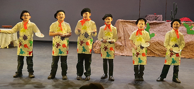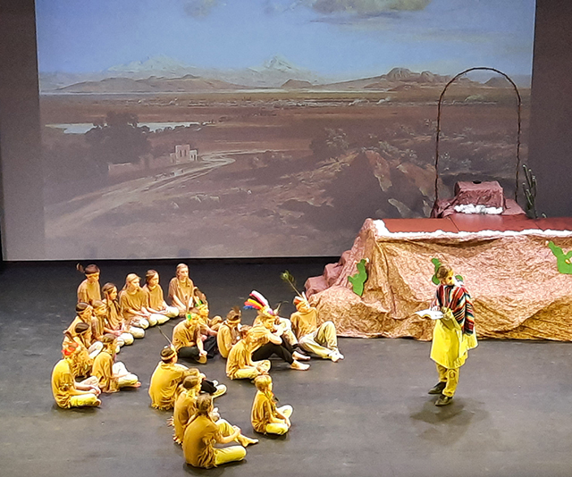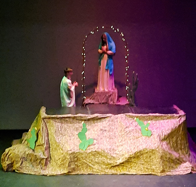 Fourth Graders explained what type of tests scientists have performed on Juan Diego's tilma: Liam Stubbers, Weston Wassmuth, Tyler Nuxoll, Micah Hinds, Lucas Wimer and Johnny Duman. Photo by SJB. ![]() Juan Diego, played by Tommy Rose climbs Tepeyac Hill and sees a vision of Mary, played by Sarah Waters. Photo by SJB Academy. ![]() Second Grade students sing as girls from Mexico and the Wise Men: Rory Johnson, Khloe Ennking, Ruby Weckman, Maddie Bock, Maggie Bock, Hannah Hinds, Ava Prigge, Zane Stubbers, Cooper Frei and Levi Wimer. Photo by SJB Academy. ![]() Third Graders recited a poem about the artists who examined Juan Diego's tilma: Lucas Goodenough, Orlie Edmonds, Nash Johnson, Oliver Costa, Freddy Scribner and Gabe Spencer. Photo by SJB Academy from their Nativity Play. ![]() Bishop Zumarraga and his attendants fall to their knees as Juan Diego displays his tilma and flowers from Our Lady. Juan is played by Tommy Rose, Bishop is Simon Hagen, while attendants are Nathan Wassmuth and Connor Nuxoll. Photo by SJB Academy from their Nativity Play. ![]() Juan Diego tells the story of the birth of Jesus to native children, played by 5th & 6th grade. Photo by SJB Academy ![]() Henry Baldwin runs the lighting computer system from the upper box for St. John Bosco’s Nativity Play. Photo by SJB Academy. | COTTONWOOD
