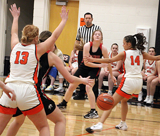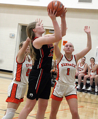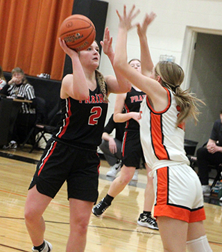 it 11-18.Elven opened the second quarter with a basket but Grangeville answered. Elven and Anderson each scored a basket to cut the deficit to 3 at 17-20. Grangeville pushed the lead back to 7 with a 2-6 run where Cash scored Prairie’s only basket. Prairie then scored 6 straight to pull within 1 point. Elven scored a basket and Anderson scored twice to make it 25-26. Grangeville scored but a free throw by Kylie Schumacher and a basket by Cash tied the score at 28 with 1:11 left in the half. Grangeville then scored a pair of baskets to take a 28-32 lead at the break. In the third quarter Grangeville seemed to score twice each time Prairie scored and built a 39-47 lead by the end of the quarter. They then scored the first basket of the fourth quarter to take a 39-49 lead, their biggest of the game. Elven then scored 5 straight points on a free throw, basket and 2 more free throws to cut the deficit in half and kick off a 15-2 scoring run. The scoring run was fueled by notching up the defensive intensity on the press and forcing turnovers and missed shots. Grangeville scored at the 5:08 mark then Kylie Schumacher scored a pair of baskets. A steal by Elven led to a lay-up by Lexi Schumacher to cut the lead to 1 point. Another turnover led to Elven scoring on an inbounds play to give Prairie their first lead of the game at 52-51 with 3:13 left to play. A steal by Shears led to a lay-up by Hanson to make it 54-51 with 2:32 left. The Bulldogs broke their scoring drought with 2 free throws with 2:03 left. Prairie answered with 2 free throws by Elven for a 56-53 lead. Grangeville got 2 free throws with 1:44 left. Then Grangeville’s Caryss Barger was fouled. She missed the first free throw but made the second to tie it. Somehow the scoreboard operator thought she made both and had Grangeville ahead 56-57 with 1:16 to play. The referees and scorebook got it fixed. Grangeville had to foul Prairie a couple of times before they could shoot free throws. Prairie missed 2 but Grangeville missed a shot at the other end and Prairie rebounded. Elven was fouled and made the first of 2 free throws with 7.6 seconds left to give Prairie a 1 point lead. Grangeville inbounded and called timeout. They inbounded again after getting the ball to halfcourt and called another timeout with 1.7 seconds left. Once Grangeville got set up for the inbounds play, Prairie called timeout to develop a defense against that set-up. Apparently coach Lori Mader spotted something as Lexi Schumacher was in the perfect spot to intercept Grangeville’s inbounds pass to end the game. Elven wound up with 20 points to lead all scorers. Kylie Schumacher scored 13. Lexi Schumacher scored 8. Prairie got quality minutes from bench players Anderson and Cash who had 6 and 4 points respectively. Hanson scored 4 and Shears 2. Grangeville had a 33-39 edge on the boards. Elven and Kylie Schumacher each had a double-double as Elven had 13 rebounds and Kylie Schumacher had 11. Kylie Schumacher had 6 steals and Hanson had 5 with several of each in the fourth quarter run. Lexi Schumacher had 4 assists while Elven and Hanson had 3 each. Prairie was 20 for 50 from the field 40%, and 12 for 23 at the line, 52%. Grangeville was 22 for 56 from the field, 39%, and 10 for 16 at the line, 63%. Prairie is now 13-1 on the season and 9-0 in league play. Prairie also won the JV game, 46-39. Prairie never trailed in the game as Anderson started the scoring with a 3-point play. Grangeville scored 2 free throws then Prairie scored 6 straight. Schlader scored a lay-up and Schumacher scored twice for a 9-2. Lead. Grangeville scored 4 to get within 3 but Mikayla Rowland stole the ball and scored with 8 seconds left to make it 11-6 at the end of 1. Alli Rambo scored a putback to start the second quarter and Brannan made a free throw. A 2-6 run by Grangeville cut the lead to 4. A putback by Halle Rowland and 2 free throws by Blake Uhlenkott pushed the lead back to 8. Grangeville scored at the buzzer to trail 22-16 at the half. Grangeville twice got within 3 in the third quarter but each time Prairie responded. After a Grangeville 3 to open the quarter, Schumacher scored. Another Grangeville basket cut the lead to 3 then Schumacher, Brannan and Anderson each scored a basket for a 30-21 lead. After a Grangeville 3, Halle Rowland scored twice to make it a 10-point margin. 3 Grangeville free throws against a basket by Anderson made it 36-27 at the end of 3. Grangeville scored 4 straight to pull within 5. Schumacher scored then Grangeville scored 2 free throws to again pull within 5. Rambo scored a putback but Grangeville answered to make it 40-35 with 4:00 left. Prairie then scored 6 straight to take a 46-35 lead. Schlader, Schumacher and Halle Rowland each scored to make it 46-35 with 2:46 to play. Grangeville scored the final 4 points of the game to cut the final margin to 7. Schumacher scored 12 and had 10 rebounds for a double-double. Halle Rowland scored 8, Anderson 7, Brannan and Schlader 5 each, Rambo 4, Uhlenkott 3 and Mikayla Rowland 2. Prairie had a 43-30 advantage on the boards. Brannan also had 10 to lead the team with Schumacher. Anderson and Schumacher each had 6 steals and Brannan had 5 assists. The JVs were 20 for 62 from the field, 32%, and 6 for 20 at the line, 30%. Grangeville was 12 for 36 from the field, 33%, and 12 for 18 at the line, 67%. Prairie 11 17 11 18 -57 Grangeville 18 14 15 9 -56 Prairie-L. Schumacher 3-15, 2-4, 8; Shears 0-2, 2-2, 2; Hanson 2-5, 0-0, 4; Elven 7-12, 6-11, 20; K. Schumacher 5-9, 2-6, 13; Cash 2-2, 0-0, 4; Anderson 3-5, 0-0, 6. 3-pointers-K. Schumacher. Grangeville-Barger 3-10, 3-5, 9; Wagner 4-9, 2-2, 12; Long 5-9, 0-2, 10; Green 8-16, 3-5, 19; Vanderwall 0-11, 2-2, 2; Adams 0-0, 0-0, 0; Wilkinson 0-0, 0-0, 0; Told 0-0, 0-0, 0; Lefebvre 2-2, 0-0, 4. 3-pointers-Wagner 2. ![]() Hailey Hanson makes a pass to Kylie Schumacher who has set up in the low block at Kendrick. ![]() Lexi Schumacher puts up a shot in the lane at Kendric