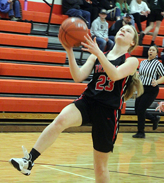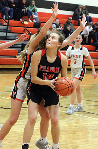 Lexi Schumacher made a free throw, Sydney Shears scored on a drive and Sage Elven scored twice to make it 9-0.C.V. got on the board with 2 free throws at the 5:28 mark. Kylie and Lexi Schumacher each scored to make it 13-2. C.V. then got their first basket on a 3-pointer. That was followed by a basket by Shears, 2 free throws by Lexi Schumacher and a lay-up by Elven to make it 19-5. The Rams then scored their first 2-point basket but Prairie came back with a 10-0 run. Hailey Hanson hit a 3 to start it. Ellie Nuxoll made a free throw then Lexi Schumacher scored 3 straight baskets off of C.V. turnovers, 2 of them steals by Lexi. That made it 29-7. After another C.V. basket, Lexi closed out the first quarter with a 3-pointer and a lay-up to make it 34-9. C.V. scored to open the second quarter and Kylie Schumacher answered with a lay-up. After another C.V. basket, Nadia Cash and Elven each scored and Lexi Schumacher added a free throw to make it 41-13. After a C.V. free throw, a steal by Kylie Schumacher led to a lay-up by Lexi Schumacher. The Rams then scored a basket and a free throw before Erica Schlader got in the scoring column with a lay-up. After another C.V. basket, Aubree Rehder closed out the first half scoring with a bank shot at the buzzer. The third quarter was nearly a duplicate of the first quarter as Prairie outscored C.V. 35-7 to take an 82-26 lead into the fourth quarter. In the first quarter Lexi Schumacher scored 16 of Prairie’s 34 points. In the third quarter 6 different players scored at least 4 points. Lexi had 4 baskets including a 3 for 9 points. Elven and Kylie Schumacher each had 3 baskets for 6 points. Nuxoll had 2 baskets and 2 free throws for 6 points. Finally Sydney Shears had 2 baskets and Mia Anderson had a basket and 2 free throws for 4 points each. The fourth quarter was played with a running clock and Prairie outscored the Rams 10-2. Rehder scored 5 on 2 baskets and a free throw. Nuxoll scored a basket and a free throw and Schlader added a basket. Lexi Schumacher wound up with 28 points to lead the scoring. Elven with 14, Kylie Schumacher with 12 and Nuxoll with 10 were also in double figures. Shears scored 8, Rehder 7, Anderson and Schlader 4 each and Hanson 3. Prairie had a 44-33 advantage on the boards led by Kylie Schumacher with 9 and Elven with 8. 9 different plays had at least 2 steals led by Shears and Kylie Schumacher with 7 each. Nuxoll, Rehder and Lexi Schumacher had 5 steals each. Lexi and Kylie Schumacher each had 5 assists while Hanson and Shears had 4 assists each. Prairie was 38 for 78 from the field, 49%, and 11 for 18 at the line, 61%. C.V. was 11 for 42 from the field, 26%, and 5 for 12 at the line, 42%. Prairie won the 2-quarter JV game 34-7. Prairie jumped out to a 10-0 lead with Mia Anderson scoring 2 baskets while Zoey Behler, Reagan Brannan and Beka Schumacher scored a basket each. C.V. got on the scoreboard at the 3:14 mark. Anderson followed with a pair of baskets to make it 14-2. After a C.V. free throws, Erica Schlader scored the final 5 points of the quarter on 2 baskets and a free throw. Prairie then scored the first 15 points of the second quarter for a 34-3 lead. Beka Schumacher started the run with a lay-up then Schlader scored 2 baskets and a 3. Faith Cash scored 2 baskets and Kenly Forsmann finished off Prairie’s scoring with a steal that led to a lay-up. C.V. then scored a free throw and a 3 to close out the game. Schlader scored 12 points to lead Prairie with Anderson scoring 8, Schumacher and Cash 4 each and Brannan, Behler and Forsmann 2 each. Prairie controlled the boards 29-12 with Brannan grabbing 8 to lead the team. Schlader had 7 steals while Brannan had 5 steals and 3 assists. Prairie was 16 for 48 from the field, 33%, and 1 for 5 at the line, 20%. C.V. was 2 for 6 from the field, 33%, and 2 for 5 at the line, 40%. Prairie 34 23 35 10 -92 C.V. 9 10 7 2 -28 Prairie-L. Schumacher 11-19, 4-7, 28; Shears 4-8, 0-0, 8; Hanson 1-2, 0-0, 3; Elven 7-10, 0-0, 14; K. Schumacher 6-8, 0-0, 12; Cash 1-2, 0-0, 2; Nuxoll 3-6, 4-6, 10; Rehder 3-11, 1-2, 7; Anderson 1-6, 2-2, 4; Kalmbach 0-4, 0-0, 0; Schlader 2-2, 0-1, 4. 3-pointers-L. Schumacher 2, Hanson. C.V.-Pfefferkorn 3-8, 2-4, 8; Martinez 2-8, 0-0, 4; E. Lundgren 2-10, 0-2, 4; Reuben 1-6, 1-2, 4; T. Lundgren 0-2, 2-2, 2; Logan 1-3, 0-2, 2; Wellard 0-0, 0-0, 0; Shira 1-2, 0-0, 2; Ward 1-3, 0-0, 2; Davis 0-0, 0-0, 0. 3-pointers-Reuben. At Troy The game at Troy was nearly as lopsided as the C.V. game Prairie
