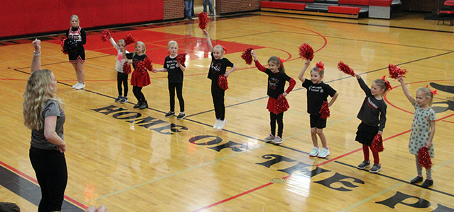 boys basketball game last Tuesday. Cheer coach Whitney Wunderlich leads