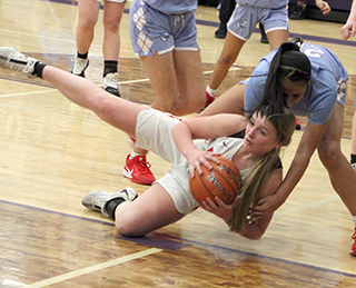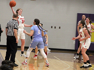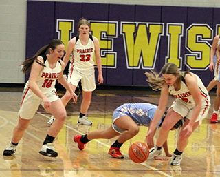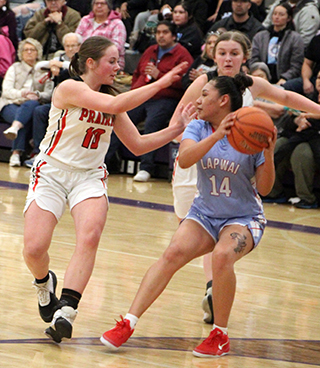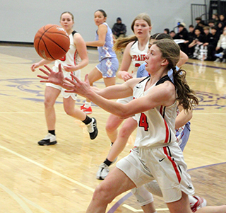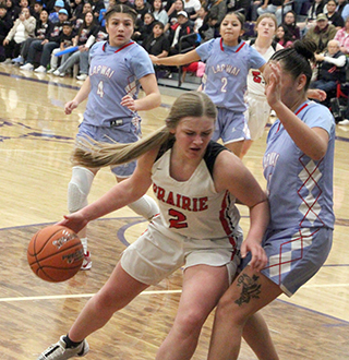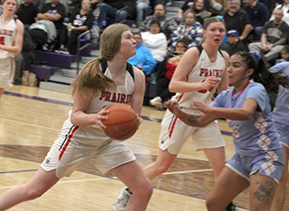 ![]() Prairie and Lapwai had played for the District title every year since 2014 making this the 12th straight matchup and Lapwai had won the previous 11. Kamiah and Lapwai met for the District title in 2013 and Prairie beat Lapwai in 2012. This also makes the 15th straight year that Prairie has made it to the State Tournament. The game didn’t start well for Prairie as Lapwai took the early lead and led by as many as 7 at 8-15. Lexi Schumacher scored 6 of Prairie’s first 8 points with Kylie Schumacher scoring the other 2. Prairie outscored Lapwai 5-2 over the final 2 minutes of the first quarter to cut the deficit to 13-17. All 5 points came at the free throw line with Kylie Schumacher hitting 3 of 6 attempts and Nadia Cash going 2 for 2. A steal by Cash to start the second quarter led to a lay-up by Lexi Schumacher. After a Lapwai free throw, Prairie scored 9 straight points to take their first lead of the game. Elven made a free throw and Lexi Schumacher scored a putback. Elven scored a lay-up and a putback and Kylie Schumacher added a lay-up on a feed from Elven to make it 24-18. Lapwai rallied back with 6 straight to tie it with 2:20 left in the half. Elven then scored 2 free throws to put Prairie back on top. Hailey Hanson sank a 3 and Lexi Schumacher closed out the half with a lay-up. Lexi’s basket came after Prairie had missed 3 close in shots and Lapwai had rebounded the third miss. Lexi stole the ball and scored to make it 31-24 at the half. Hanson scored to open the second half. Lapwai answered with a free throw. Elven scored a basket and Lexi Schumacher added a free throw for a 36-25 lead. After a Lapwai basket, Hanson scored another 3 and Lexi Schumacher a lay-up to make it 41-27. After a Lapwai free throw, Kylie Schumacher scored on a feed from Elven. Lapwai put a pair of baskets together to get back within 11 at 43-32 but Prairie closed out the third quarter with 3 straight baskets by Elven. She scored on a feed from Sydney Shears, stole the ball and scored and scored on a feed from Kylie Schumacher. That made it 49-32 after 3 quarters. Lapwai scored to open the fourth quarter but Prairie then scored 5 straight to take a 20-point lead. Kylie Schumacher scored a lay-up and then two free throws. Lexi Schumacher added a free throw to make it 54-34. Lapwai scored a 3 and then a free throw but Lexi Schumacher answered by hitting 4 of 6 free throws to again put Prairie up by 20 at 58-38. Lapwai then rallied with a 1-9 run to get back within 12 at 59-47. Kylie Schumacher scored Prairie’s only point in the run. Elven then scored 6 straight points on a baskets and 4 free throws to put Prairie up 65-47 with 35 seconds left. Lapwai’s final points came on 2 free throws and Lexi Schumacher followed by hitting 3 of 4 at the line for the final 19 point margin. Lexi Schumacher wound up as the leading scorer with 23 points. Elven was right behind with 21 points. Kylie Schumacher scored 14 with Hanson scoring 8 and Cash 2. Prairie had a 50-41 advantage on the boards led by Kylie Schumacher who had 18 rebounds. Elven added 11 boards and Shears had 10. Elven had 7 steals and 5 assists while Lexi Schumacher added 3 steals and Kylie Schumacher had 3 assists. Prairie was 21 for 64 from the field, 33%, and 24 for 39 at the line, 62%. Lapwai was 17 for 56 from the field, 30%, and 10 for 17 at the line, 59%. Prairie takes an 20-2 record into the State Tournament where they will open against Liberty Charter, the District 3 champion, at 2 p.m. MST on Thursday, Feb. 20, at Columbia High School in Nampa. It is the 11th time in 15 seasons for head coach Lori Mader that her team has won at least 20 games. Prairie 13 18 18 19 -68 Lapwai 17 7 8 17 -49 Prairie-L. Schumacher 7-20, 9-14, 23; Shears 0-5, 0-2, 0; Hanson 3-9, 0-0, 8; Elven 7-13, 7-12, 21; K. Schumacher 4-11, 6-10, 14; Cash 0-5, 2-2, 2; Nuxoll 0-0, 0-0, 0; Rehder 0-0, 0-0, 0. 3-pointers-Hanson 2. Lapwai-George 1-10, 2-6, 4; S. Picard 1-14, 5-5, 7; Domebo 5-12, 1-2, 12; Oatman 4-9, 0-0, 10; Bisbee 5-9, 1-2, 12; J. Picard 1-2, 1-2, 4; WhiteTemple 0-0, 0-0, 0; Payne 0-0, 0-0, 0; Kipp 0-0, 0-0, 0; Samuels 0-0, 0-0, 0. 3-pointers-Oatman 2, Domebo. ![]() Coach Lori Mader went for a hug with her senior point guard Lexi Schumacher as the team celebrated after beating Lapwai for Prairie’s first District Championship since 2012. ![]() There was more celebrating after Prairie was awarded the District Championship trophy. ![]() Lexi Schumacher goes for a loose ball for a steal. She turned it into a lay-up on the other end. Also shown are Nadia Cash and Sage Elven. ![]() Sage Elven goes for a lay-up. Also shown is Kylie Schumacher. ![]() Hailey Hanson shoots one of her 3-pointers against Lapwai. ![]() Lexi Schumacher grabs a loos ball near the Prairie basket and appears to get fouled. ![]() Sydney Shears goes after a long rebound. Also shown are Nadia Cash and Sage Elven. ![]() Nadia Cash puts up a shot against Lapwai. ![]() Lexi Schumacher handles the ball against Lapwai. In the background is Hailey Hanson. ![]() Sage Elven makes a steal and looks to throw the ball towards Nadia Cash. Also shown is Kylie Schumacher. ![]() Nadia Cash and Lexi Schumacher doubleteam a Lapwai ballhandler in the backcourt. UPDATED PIRATES GIRLS BASKETBALLSCHEDULE FOR 2024-25 JV games start at 6 p.m., varsity to follow unless indicated.