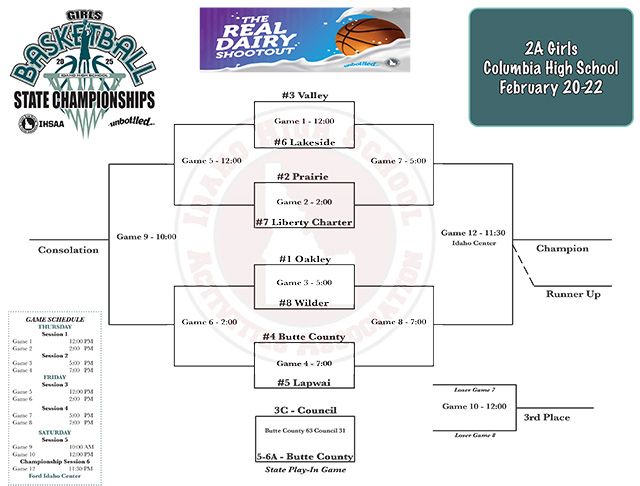 Prairie to open against Liberty Charter at State Prairie is the #2 seed at the State Tournament and will open against #7 seed Liberty Charter, the District 3 tournament champion. Their record is 17-5. They were runner-up in their league. The other half of Prairie’s bracket features #3 seed Valley, 19-5, the runner-up in District 4 both in league and at District, against District 1 champion Lakeside, 13-7, the #6 seed. In the evening bracket #1 seed Oakley, 21-1, the District 4 league and tournament champion, against #8 seed Wilder, 18-3, the District 3 league champion and tournament runner-up. The final game of the night features #4 seed Butte County, 17-7, the District 5-6 league and tournament champion, against #5 seed Lapwai, 20-4, the District 2 league and tournament runner-up. Winners bracket games are at 5 and 7 p.m. on Friday with the championship game at 11:30 a.m. Saturday at the Ford Idaho Center. Consolation bracket games are at noon and 2 p.m. Friday. The consolation final is at 10 a.m. Saturday at Columbia High School with the 3rd place game following at noon at the same site. Below is the State Bracket. All times listed are Mountain Time. ![]() |