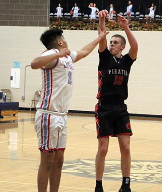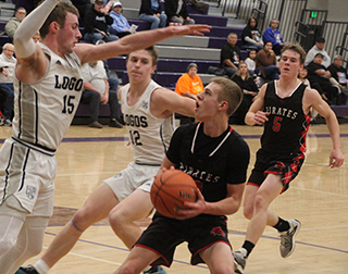Pirates out in 2 at District For the second straight year the Prairie Pirates lasted just 2 games at the District Tournament. On Wednesday, Feb. 19, they traveled to Lapwai and lost 49-50 in double overtime. They had a bye for the second round and on Monday, Feb. 24, they faced Logos and lost 41-58 at Lewiston High School. At Lapwai The game at Lapwai was how a #4 vs. #5 game should be. Prairie started well as Phil Schwartz scored a basket from the baseline and Riley Shears followed with a 3 from the top of the key for a 5-0 lead. After Lapwai scored, Levi Gehring scored to make it 7-2.