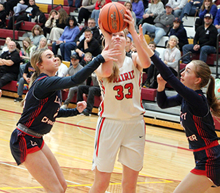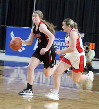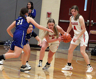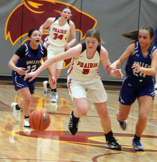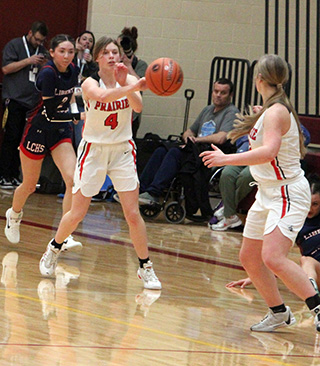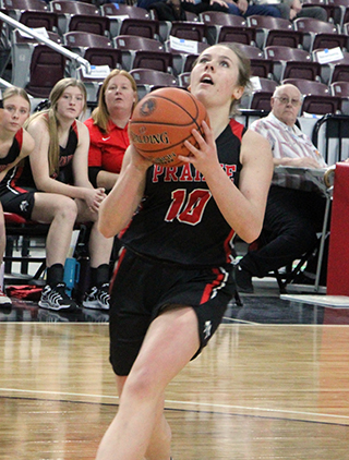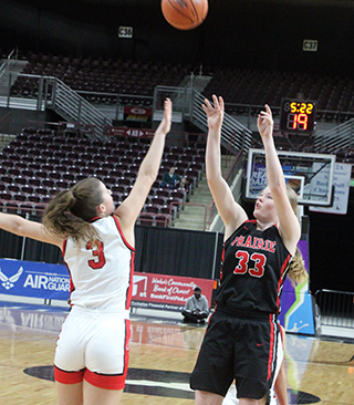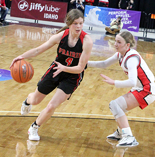 faced #1 seeded Oakley at the Idaho Center and lost 51-62. It was the 10th time in 15 years as coach that Lori Mader’s teams have reached the championship game and the 8th time they have finished in second. Vs. Liberty Charter In the opener against Liberty Charter, Prairie forced 32 turnovers from the District 3 champions as they rolled to an easy win.![]() Prairie jumped out to a 9-0 lead. Lexi Schumacher set the tone by stealing the ball and scoring the game’s first 2 points. A steal by Sydney Shears led to a 3 by Hailey Hanson. Lexi Schumacher scored a perimeter shot and Hanson scored 2 free throws to make it 9-0. Liberty Charter finally got on the board at the 5:18 mark. Sage Elven then scored after a steal and Shears added a free throw to make it 12-2. Liberty answered with a 3 and 2 free throws to pull within 5 but Elven scored a lay-up to make it 14-7 at the end of the first quarter. That started a 14-0 run as Prairie scored the first 12 points of the second quarter to take a 26-7 lead. Elven opened the scoring with a lay-up and Kylie Schumacher followed with 3 straight baskets. Elven closed the run with 2 more baskets. Liberty broke through with a free throw then Lexi Schumacher scored 2 free throws and a lay-up to make it 30-8. After another Liberty free throw, Lexi connected for 3 to make it 33-9. After a Liberty putback, Lexi closed out the first half with a 14 foot shot to make it 35-11 at the half. Liberty scored the first 2 points of the second half then Prairie scored 14 straight. Shears scored to start the run. A steal by Elven led to her scoring a lay-up Lexi Schumacher scored a free throw. Elven scored from the side. Lexi hit a putback and Mia Anderson hit a 3. Kylie Schumacher then scored on an inbounds play to make it 49-13. Liberty scored 2 free throws then Kylie Schumacher and Ellie Nuxoll each scored to make it 53-15. A Liberty free throw made it 53-16 after 3 quarters. There is no running clock rule at State. Shears scored a putback to open the fourth quarter. Liberty then put together 5 straight points before Elven scored twice on putbacks to make it 59-21. Liberty scored their final point at the line with 3:26 left. Hanson then hit a 3 and Elven scored to close out the game. Elven scored 20 to lead the Pirates with Lexi Schumacher scoring 16 and Kylie Schumacher 10. Hanson added 8 points with Shears scoring 5, Anderson 3 and Nuxoll 2. Prairie dominated the boards 49-26 with Elven grabbing 14 and Kylie Schumacher 12 as each posted a double-double. Kylie Schumacher, Lexi Schumacher, Hanson and Elven each had 5 steals while Kylie Schumacher, Shears, Aubree Rehder, Lexi Schumacher and Hanson each had 2 assists. Prairie was 27 for 78 from the field, 35%, and 6 for 10 at the line, 60%. Liberty Charter was 6 for 24 from the filed 25%, and 9 for 21 at the line, 43%. Prairie 14 21 18 11 -64 L.C. 7 4 5 6 -22 Prairie-L. Schumacher 6-19, 3-4, 16; Shears 2-9, 1-2, 5; Hanson 2-5, 2-2, 8; Elven 10-25, 0-0, 20; K. Schumacher 5-14, 0-0, 10; Nuxoll 1-1, 0-2, 2; Cash 0-1, 0-0, 0; Rehder 0-0, 0-0, 0; Anderson 1-3, 0-0, 3; Schlader 0-1, 0-0, 0; Brannan 0-0, 0-0, 0; Kalmbach 0-0, 0-0, 0. 3-pointers-Hanson 2, L. Schumacher, Anderson. Liberty Charter-Flores 3-5, 1-4, 7; Thompson 0-1, 0-2, 0; Reece 0-4, 4-4, 4; Albright 1-3, 1-3, 4; Criddle 1-1, 0-0, 2; Camarillo 1-3, 2-4, 4; Ward 0-2, 1-4, 1; Nicley 0-2, 0-0, 0; Cardarelli 0-0, 0-0, 0; Molina 0-1, 0-0, 0; Hendrickson 0-1, 0-0, 0. 3-pointers-Albright. Vs. Valley In the semifinal against Valley it was a close game until a 21-5 run by the Pirates put them in control. Prairie scored off the opening tap as Lexi Schumacher fed the ball to Kylie Schumacher a lay-up.Valley then took the lead with 2 free throws and a basket. Prairie tied it on a basket by Lexi Schumacher. Valley took back the lead with a 3 but Prairie answered with a pair of baskets by Elven to make it 8-7. Valley scored to retake the lead but that was their final lead of the game. Kylie Schumacher scored a lay-up to put Prairie back on top and Elven added a lay-up. Valley tied it with a 3 at 12-12 with 2:40 left in the first quarter. Prairie then closed out the first quarter with 2 free throws by Lexi Schumacher and a putback by Kylie Schumacher for a 16-12 lead. Prairie then scored the first 6 of the second quarter on a basket each by Lexi Schumacher, Kylie Schumacher and Anderson. Valley scored to break the drought but Kylie Schumacher answered with a lay-up. After a 3 by Valley, Prairie scored 9 straight points to complete the aforementioned 21-5 run. Kylie Schumacher scored a lay-up. Elven scored after a steal then added a putback. Elven made the first of 2 free throws and then Kylie Schumacher rebounded the second one and scored to make it 33-17. Valley scored 2 free throws and a basket to cut the lead to 12 but Hanson scored after a steal. A 3 by Valley was answered by a basket by Anderson to make it 37-24 at the half. Valley scored to open the second half then Prairie got a lay-up by Lexi Schumacher. Lexi followed that with a 3 and Elven scored a putback to make it 44-26. Valley scored a pair of baskets that bracketed a lay-up by Kylie Schumacher. Prairie then scored 9 straight to take a 53-30 lead. Elven and Kylie Schumacher each made the second of 2 free throws. Elven then scored a lay-up. Lexi Schumacher made a free throw and then scored on a full-court drive. Valley scored to end the quarter with Prairie up 53-32. Shears opened the fourth quarter scoring with a free throw and Valley answered with a free throws. Prairie then scored 10 straight points as Lexi Schumacher sank a pair of 3’s and Kylie Schumacher scored 2 lay-ups to make it 64-33 with 3:05 to play. Valley scored 5 straight points then Lexi Schumacher sank another 3. After a Valley basket, Anderson closed out the game with a basket. Lexi Schumacher led the scoring with 23 points while Kylie Schumacher scored 21. Elven had 16 points and 13 rebounds. Anderson scored 6 with Hanson scoring 2 and Shears 1