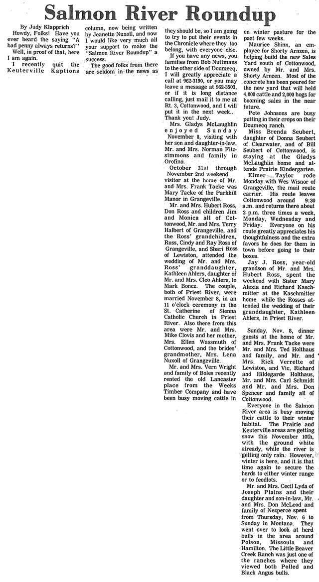 Klapprich's first Salmon River Roundup column from the Nov. 13, 1975