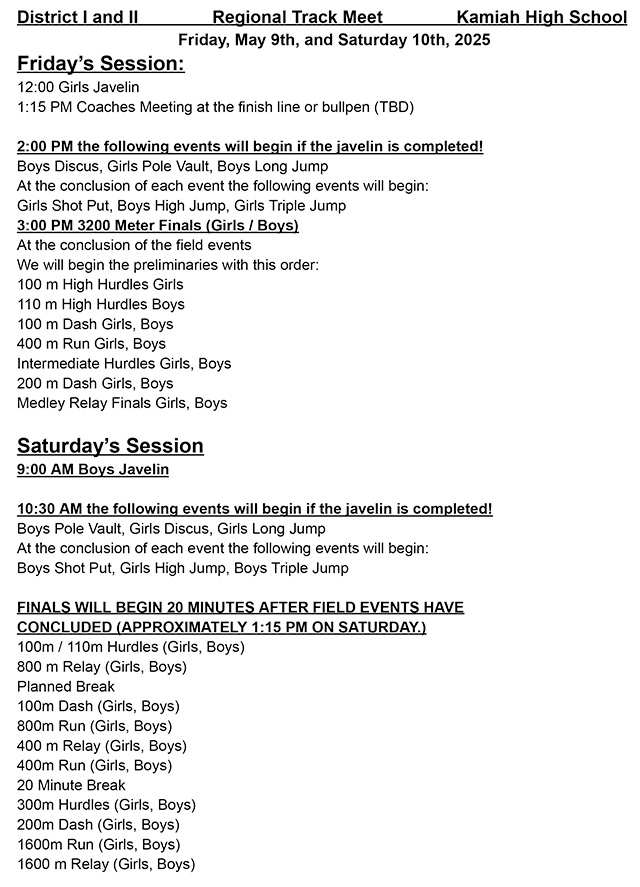 The District I-II Regional Track Meet is set for this Friday and Saturday, May 9-10, at Kamiah.