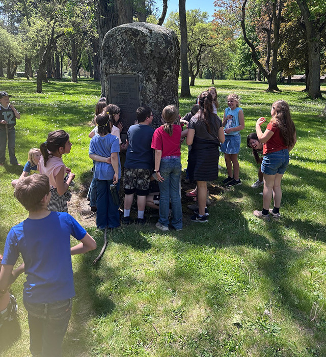 Mr. Wassmuth captivates students as he points out the site where the Whitmans built Idaho’s first gristmill—one of many “firsts” he shares during his legendary walking tour of Spalding National Park. ![]() Students gather around the legendary stone boy as Mr. Wassmuth shares the Nimíipuu tale of the child who was turned to stone for disobedience. Each year, students knock and ask, “Little boy, little boy, can I get you anything?”—only to hear the classic reply of nothing, nothing at all. |