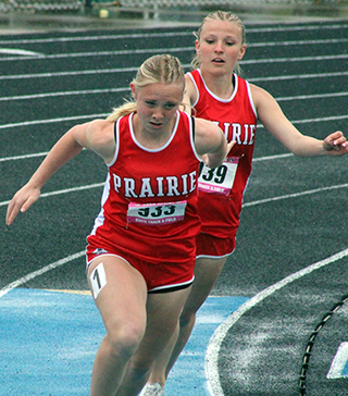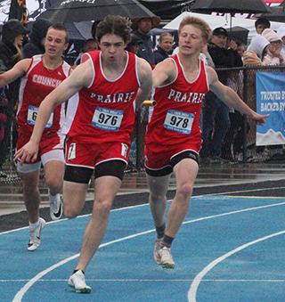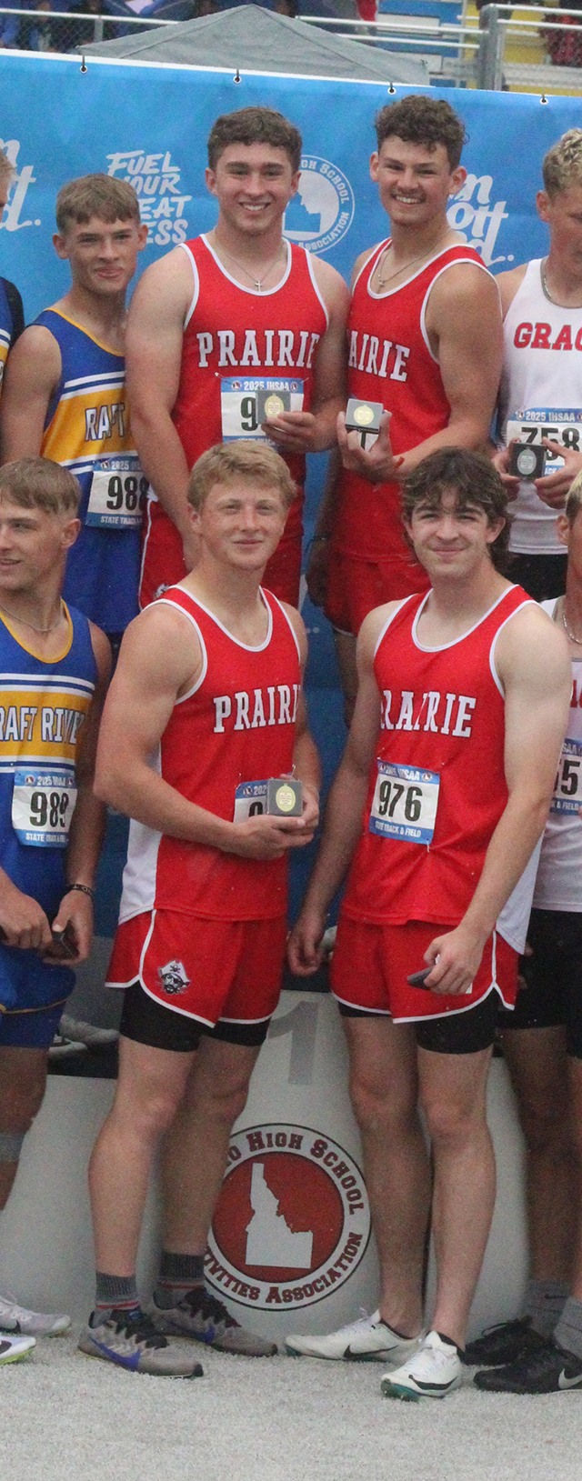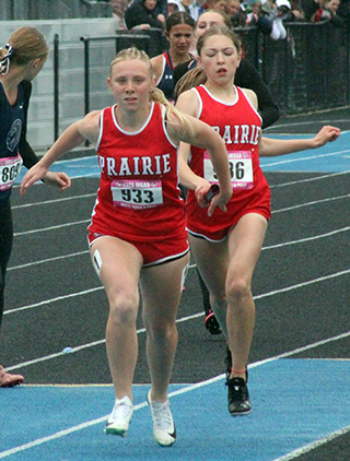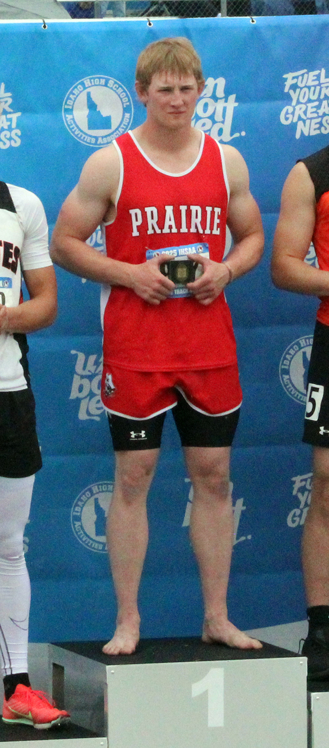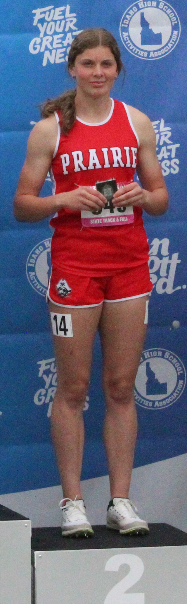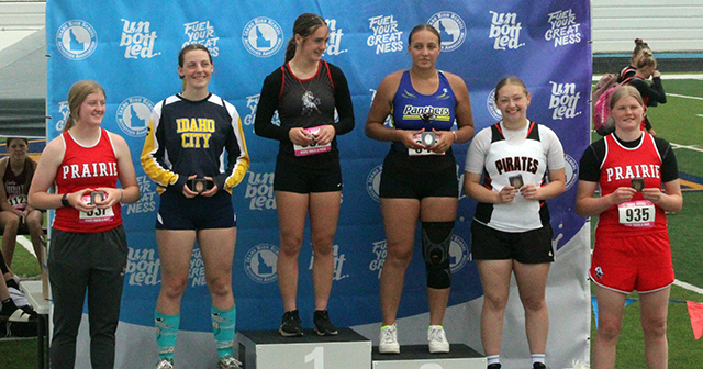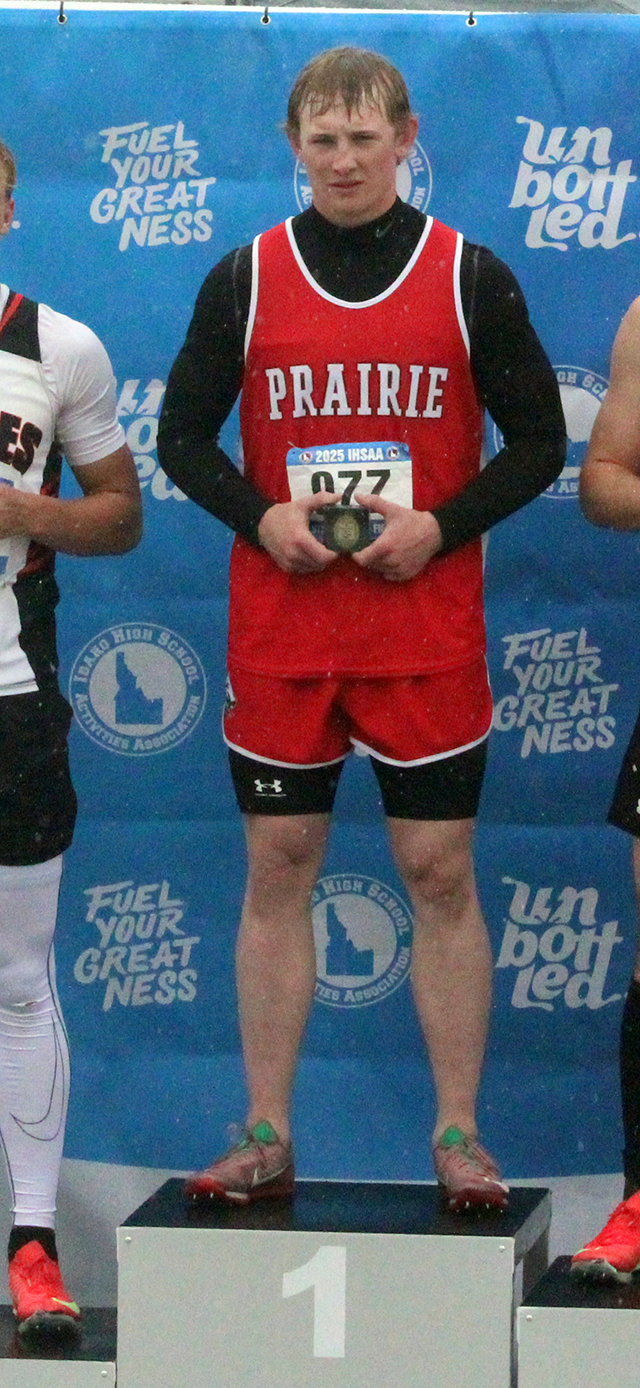 Track team brings home two state trophies Dylan Uhlenkott earned 4 gold medals at the State Track Meet while Sage Elven won her third straight gold medal in the discus. The boys and girls teams each brought home the second place team trophy, improving on last year when the boys were third and the girls fourth. Uhlenkott won the open 100 in 11.15, the 200 in 22.55 and the 400 in 48.82. He broke the state meet record in the prelims with a time of 48.53. That is also a new school record breaking the mark of 49.78 set a couple weeks ago at Kamiah. Elven won the discus with a mark of 142’0”. She also medaled in the shot put, placing second at 38’2” and in the javelin, placing 6th at 99’2”. The boys repeated as gold medalists in the 4x100 and 4x200. Cole Duclos, Matt Wemhoff, Secrest and Uhlenkott won the 4x100 in 43.80, just 0.2 seconds off the school record set last year at State. The 4x200 team of Duclos, Peyton Stamper, Wemhoff and Secrest won with a time of 1:32.65. They got some help when favored Logos had a bad second handoff but Secrest wound up passing at least two other runners in the final 50 meters to pull out the win. Also medaling at state for the boys team was Wemhoff with a 5th place finish in the 400 at 51.78. Also medaling at state for the girls were: Sydney Shears finished 2nd in both the 800 and 1600 in 2:21.41 and 5:21.53 respectively. Hailey Hanson earned 2 medals. She was 5th in the discus at 116’6”, 5th in the javelin at 99’5”. She just missed another medal with a 7th in the shot put at 34’6” but still earned 2 points for the team. Mia Anderson finished 5th in the 300 hurdles in 48.49. Aubree Geis finished 5th in the 400 at 1:00.34, a personal best. She was also 14th in the 200 in 27.79. Nadia Cash finished 6th in the long jump at 16’0” to earn a medal. She was also 14th in the 100 in 13.67. All 4 girls relays made it onto the medal stand. The 4x200 team of Cash, Anderson Geis and Kennedy Riener was 2nd in 1:49.53. The 4x100 team of Cash, Anderson, Sierra Oliver and Kennedy Riener was 4th in 51.62. The medley team of Aubree Rehder, Avery Riener, McKenzie Hope and Shears was 5th in 1:56.76. The 4x400 team of Avery Riener, Anderson, Geis and Shears was 6th in 4:17.33. Other boys results: Nate Forsmann earned 2 points for the team by finishing 7th in the discus with a mark of 135’3”. Phineas Fitch placed 13th in the 1600 in 4:54.10. Briggs Rambo was 14th in the 110 hurdles in 17.52. Duclos was unable to clear opening height in the pole vault, which was equal to the school record mark he holds at 10’6”. Other girls results: Oliver earned 2 points for the team in the pole vault by equaling her school record mark of 9’0” which was good for 7th place. She was also 13th in the 100 hurdles in 17.84 and 14th in the 300 hurdles in 51.49. Blake Uhlenkott earned 1/6 of a point for the team with a 6-way tie for 8th in the pole vault at 8’0”. Macie Uhlenkott was 10th in the discus at 101’10”. Avery Riener finished 11th in the triple jump at 32’3½”. Callie Remacle was 13th in the high jump at 4’8”. Alli Rambo was 14th in the pole vault at 7’6”. As a team the boys scored 56 points, well behind first place Logos, who had 150, and 4 points ahead of third place Butte County. The girls team scored 80.16 points. Logos was first with 112 points. They were 7 points ahead of third place Valley. ![]() ![]() Sage Elven won her third straight gold medal in the discus at State. She also took second in the shot put. ![]() Cole Duclos is about to hand off to Peyton Stamper in the 4x200 while at right, disaster struck the favored Logos squad. ![]() Matt Wemhoff hands off to Ben Secrest for the final leg of the 4x200 relay. Secrest powered past two other anchor runners in the final 50 meters to claim first place. ![]() Troy's Jackson Marone nosed out Dylan Uhlenkott in the prelims of the 100 but Uhlenkott won in the finals. ![]() Dylan Uhlenkott comes off the curve with the lead in the 200 meter dash and went on to win. ![]() Ben Secrest hands off a lead to Dylan Uhlenkott in the 4x100 after an outstanding third leg where he passed two runners. Uhlenkott maintained the lead to give Prairie the win. ![]() Sydney Shears runs through the rain in the 800 meter final where she finished 2nd. ![]() Sydney Shears pulled up alongside the leader in the 1600 in the final straightaway but the Grace runner managed to hold on for the win. ![]() ![]() Hailey Hanson finished 5th in the discus for a state medal and just missed a medal in the shot put finishing 7th. She also earned a 5th in the javelin. ![]() Mia Anderson is about to clear a hurdle in the 300 meter finals where she finished 5th. ![]() Nadia Cash went 16'0" in the long jump to finish 6th. ![]() Aubree Geis in the 400 meter dash final where she finished 5th. ![]() Matt Wemhoff finished 5th in the 400. ![]() ![]() Aubree Rehder gets out of the starting blocks in the medley relay. Also shown is McKenzie Hope handing off to Sydney Shears for the final leg. Prairie placed 5th in the event. ![]() ![]() Nadia Cash hands off to Kennedy Riener and Aubree Geis hands off to Mia Anderson in the 4x200 relay where Prairie finished 2nd. ![]() Avery Riener hands off to Mia Anderson in the 4x400 relay where Prairie finished 6th. ![]() Sierra Oliver hands off to Mia Anderson in the 4x100 where Prairie finished 4th. ![]() Nate Forsmann finished 7th in the discus, just missing out on a medal but earning the team 2 points. ![]() Callie Remacle clears the bar in the high jump. ![]() Sierra Oliver equaled her school record of 9'0" in the pole vault to finish 7th and earn the team 2 points. ![]() Blake Uhlenkott finished in a 6-way tie for 8th in the pole vault earning the team 1/6 of a point. ![]() Alli Rambo clears opening height in the pole vault. ![]() Avery Riener int he triple jump. ![]() Briggs Rambo in the 110 hurdles prelims. ![]() Macie Uhlenkott finished 10th in the discus. ![]() Phineas Fitch in the 1600. 