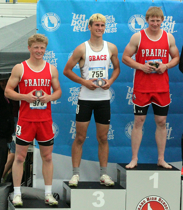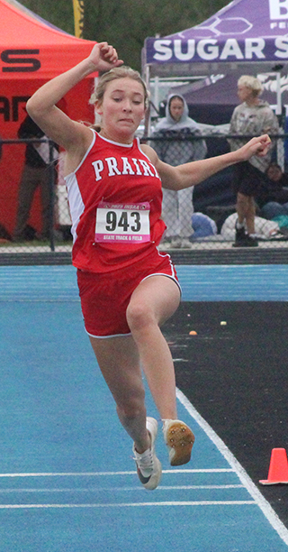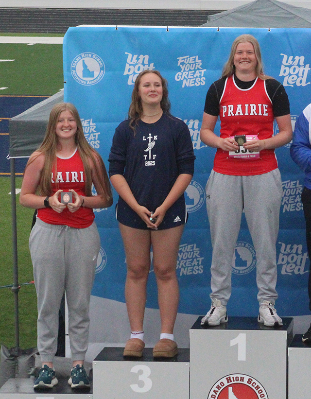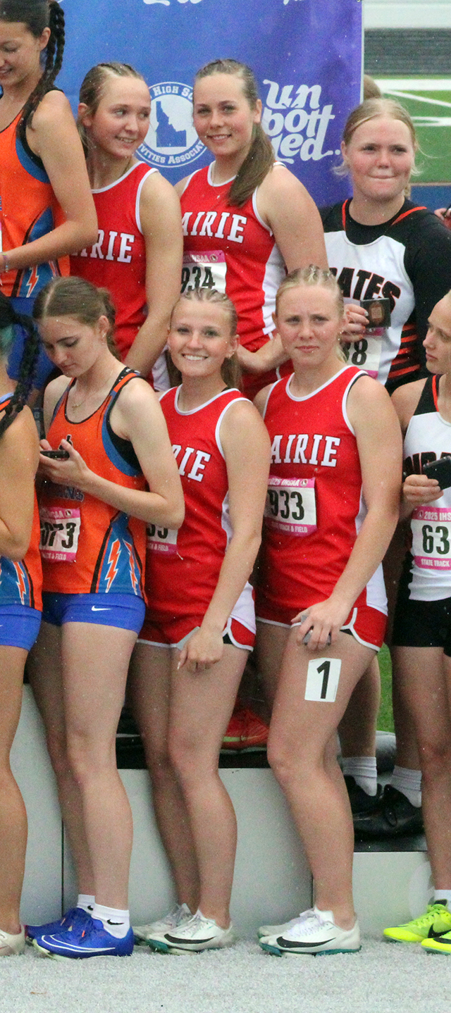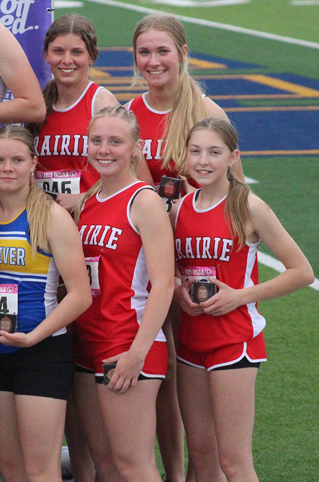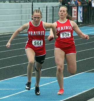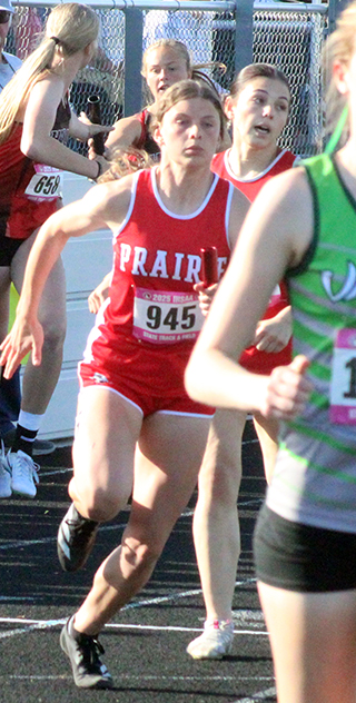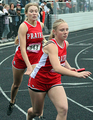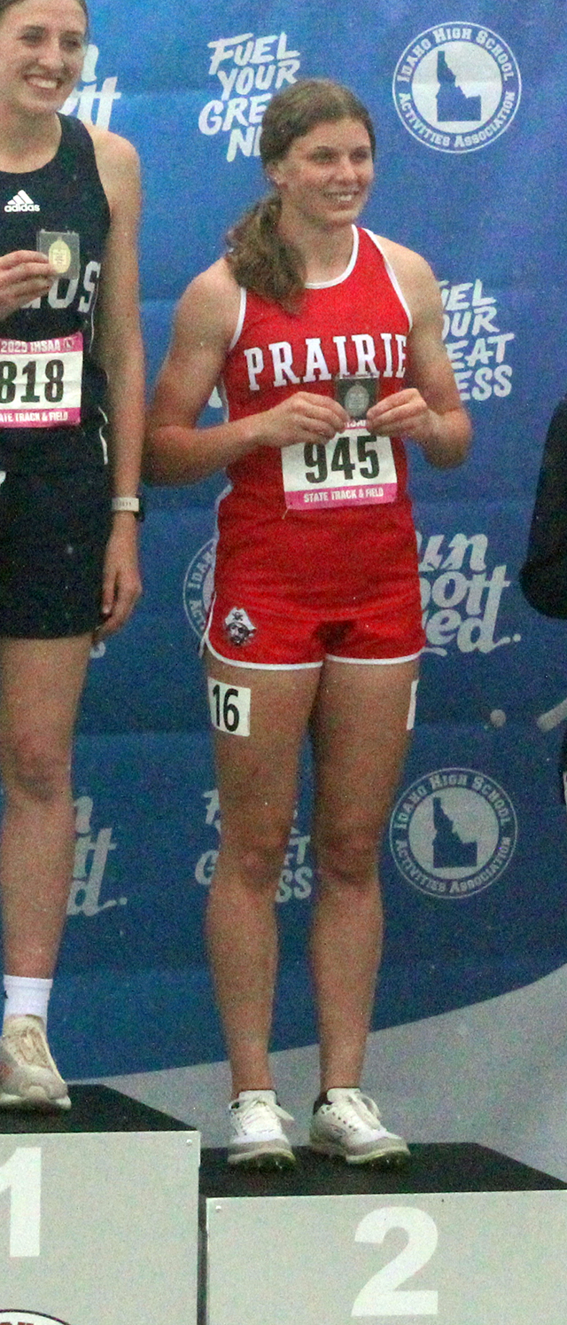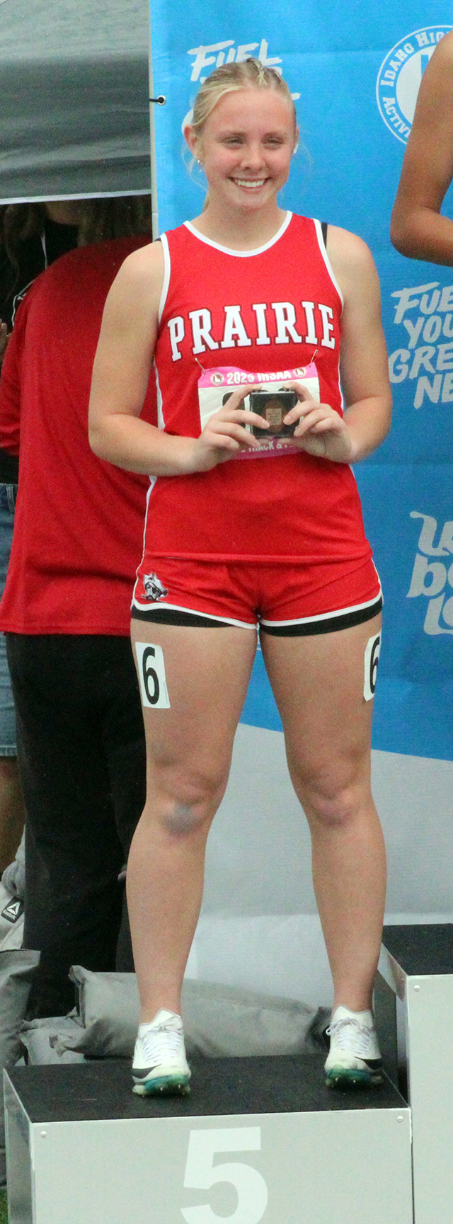Track team brings home two state trophies Dylan Uhlenkott earned 4 gold medals at the State Track Meet while Sage Elven won her third straight gold medal in the discus. The boys and girls teams each brought home the second place team trophy, improving on last year when the boys were third and the girls fourth. Uhlenkott won the open 100 in 11.15, the 200 in 22.55 and the 400 in 48.82. He broke the state meet record in the prelims with a time of 48.53. That is also a new school record breaking the mark of 49.78 set a couple weeks ago at Kamiah. Elven won the discus with a mark of 142’0”. She also medaled in the shot put, placing second at 38’2” and in the javelin, placing 6th at 99’2”. The boys repeated as gold medalists in the 4x100 and 4x200. Cole Duclos, Matt Wemhoff, Secrest and Uhlenkott won the 4x100 in 43.80, just 0.2 seconds off the school record set last year at State. The 4x200 team of Duclos, Peyton Stamper, Wemhoff and Secrest won with a time of 1:32.65. They got some help when favored Logos had a bad second handoff but Secrest wound up passing at least two other runners in the final 50 meters to pull out the win. Also medaling at state for the boys team was Wemhoff with a 5th place finish in the 400 at 51.78. Also medaling at state for the girls were: Sydney Shears finished 2nd in both the 800 and 1600 in 2:21.41 and 5:21.53 respectively. Hailey Hanson earned 2 medals. She was 5th in the discus at 116’6”, 5th in the javelin at 99’5”. She just missed another medal with a 7th in the shot put at 34’6” but still earned 2 points for the team. Mia Anderson finished 5th in the 300 hurdles in 48.49. Aubree Geis finished 5th in the 400 at 1:00.34, a personal best. She was also 14th in the 200 in 27.79. Nadia Cash finished 6th in the long jump at 16’0” to earn a medal. She was also 14th in the 100 in 13.67. All 4 girls relays made it onto the medal stand. The 4x200 team of Cash, Anderson Geis and Kennedy Riener was 2nd in 1:49.53. The 4x100 team of Cash, Anderson, Sierra Oliver and Kennedy Riener was 4th in 51.62. The medley team of Aubree Rehder, Avery Riener, McKenzie Hope and Shears was 5th in 1:56.76. The 4x400 team of Avery Riener, Anderson, Geis and Shears was 6th in 4:17.33. Other boys results: Nate Forsmann earned 2 points for the team by finishing 7th in the discus with a mark of 135’3”. Phineas Fitch placed 13th in the 1600 in 4:54.10. Briggs Rambo was 14th in the 110 hurdles in 17.52. Duclos was unable to clear opening height in the pole vault, which was equal to the school record mark he holds at 10’6”. Other girls results: Oliver earned 2 points for the team in the pole vault by equaling her school record mark of 9’0” which was good for 7th place. She was also 13th in the 100 hurdles in 17.84 and 14th in the 300 hurdles in 51.49. Blake Uhlenkott earned 1/6 of a point for the team with a 6-way tie for 8th in the pole vault at 8’0”. Macie Uhlenkott was 10th in the discus at 101’10”. Avery Riener finished 11th in the triple jump at 32’3½”. Callie Remacle was 13th in the high jump at 4’8”. Alli Rambo was 14th in the pole vault at 7’6”. As a team the boys scored 56 points, well behind first place Logos, who had 150, and 4 points ahead of third place Butte County. The girls team scored 80.16 points. Logos was first with 112 points. They were 7 points ahead of third place Valley. ![]() ![]() Sage Elven won her third straight gold medal in the discus at State. She also took second in the shot put. ![]() Cole Duclos is about to hand off to Peyton Stamper in the 4x200 while at right, disaster struck the favored Logos squad. ![]() Matt Wemhoff hands off to Ben Secrest for the final leg of the 4x200 relay. Secrest powered past two other anchor runners in the final 50 meters to claim first place. ![]() Troy's Jackson Marone nosed out Dylan Uhlenkott in the prelims of the 100 but Uhlenkott won in the finals. ![]() Dylan Uhlenkott comes off the curve with the lead in the 200 meter dash and went on to win. ![]() Ben Secrest hands off a lead to Dylan Uhlenkott in the 4x100 after an outstanding third leg where he passed two runners. Uhlenkott maintained the lead to give Prairie the win. ![]() Sydney Shears runs through the rain in the 800 meter final where she finished 2nd. ![]() Sydney Shears pulled up alongside the leader in the 1600 in the final straightaway but the Grace runner managed to hold on for the win. ![]() ![]() Hailey Hanson finished 5th in the discus for a state medal and just missed a medal in the shot put finishing 7th. She also earned a 5th in the javelin. ![]() Mia Anderson is about to clear a hurdle in the 300 meter finals where she finished 5th. ![]() Nadia Cash went 16'0" in the long jump to finish 6th. ![]() Aubree Geis in the 400 meter dash final where she finished 5th. ![]() Matt Wemhoff finished 5th in the 400. ![]() ![]() Aubree Rehder gets out of the starting blocks in the medley relay. Also shown is McKenzie Hope handing off to Sydney Shears for the final leg. Prairie placed 5th in the event. ![]() ![]() Nadia Cash hands off to Kennedy Riener and Aubree Geis hands off to Mia Anderson in the 4x200 relay where Prairie finished 2nd. ![]() Avery Riener hands off to Mia Anderson in the 4x400 relay where Prairie finished 6th. ![]() Sierra Oliver hands off to Mia Anderson in the 4x100 where Prairie finished 4th. ![]() Nate Forsmann finished 7th in the discus, just missing out on a medal but earning the team 2 points. ![]() Callie Remacle clears the bar in the high jump. ![]() Sierra Oliver equaled her school record of 9'0" in the pole vault to finish 7th and earn the team 2 points. ![]() Blake Uhlenkott finished in a 6-way tie for 8th in the pole vault earning the team 1/6 of a point. ![]() Alli Rambo clears opening height in the pole vault. ![]() Avery Riener int he triple jump. ![]() Briggs Rambo in the 110 hurdles prelims. ![]() Macie Uhlenkott finished 10th in the discus. ![]() Phineas Fitch in the 1600. 