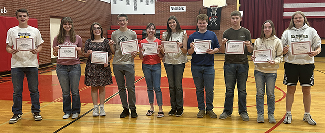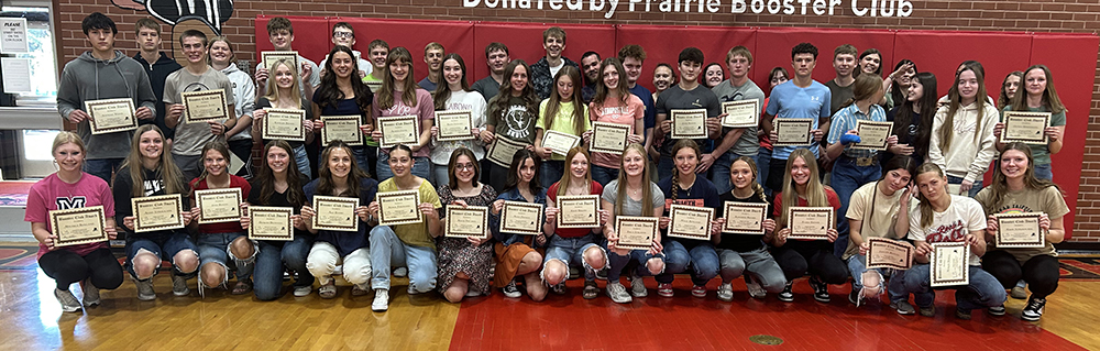Award winners ![]() The Prairie Booster Club gave certificates to every student in grades 9-12 who achieved a 3.75 or above grade point average in the first semester this year. Pictured alphabetically by grade are: Seniors-Harlee Brannan, Monica Goeckner, Natalie Goeckner, Kaylie Lockett, Jake Quintal, Briggs Rambo, Aubree Rehder, Rachael Schumacher, Hannah Schwartz, Rebecca Seubert and Carter Shears. Juniors-Sage elven, Levi Gehring, Alaina Lustig, Max Rehder, Katelyn Riener, Phil Schwartz, Sydney Shears and Ryan Stewart. Sophomores-Nadia Cash, Aubree Geis, Henry Lustig, Lillianne Lustig, Josiphine Mader, Lane Mader, Kane McIntire, Kade Quintal, Halee Rowland, Erica Schlader and Olivia Uhlenkott. Freshmen-Reagan Brannan, Alaina DeCaria, Trajan Elven, Anna Francis, Matthew Jones, Alli Rambo, Mikayla Rowland and Nathan Weber. ![]() Knowledge Bowl top point scorers are from left: Phineas Fitch, 7th; Alaina Lustig, 4th; Alaina DeCaria, 10th; Matthew Jones, 8th; Monica Goeckner, 2nd; Hannah Schwartz, 5th; Henry Lustig, 1st; Kane McIntire, 3rd; Lillianne Lustig, 6th and Sage Elven, 9th. Photos by Suzi Quintal. |