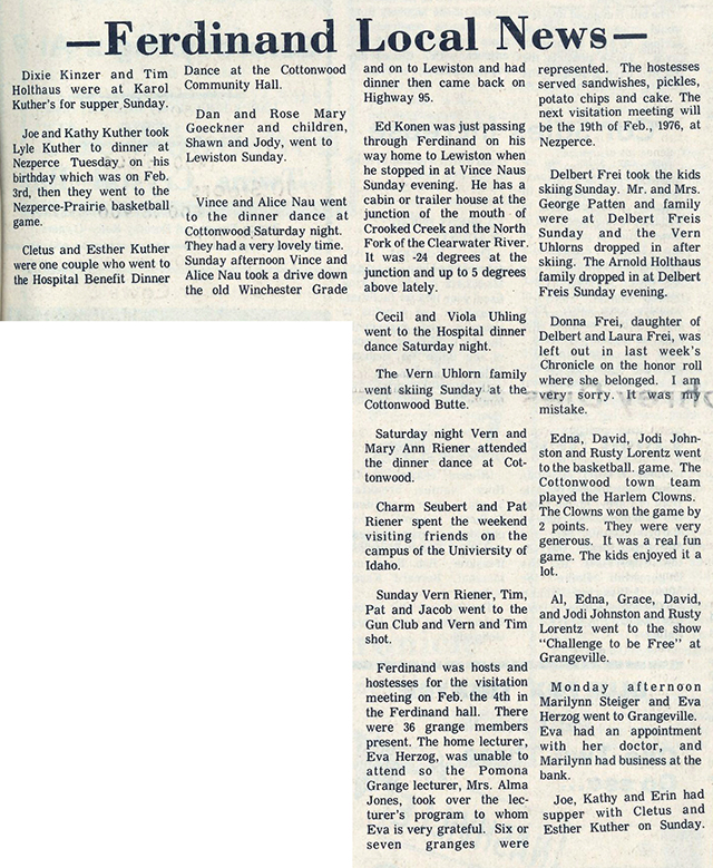 Eva Herzog's Ferdinand Local News column from the Feb. 12, 1976 edition of the Chronicle. Click on the photo for a larger