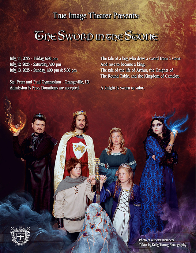 It follows the life of King Arthur from his wondrous pulling of the sword from the stone as a boy, to the rejection of his destiny in his youth, and finally to the acceptance of his rightful kingship. With Lady Guinevere at his side, he realizes his vision of Camelot, where good and right prevail, though his evil uncle, Lord Vortigern, and his manipulative sisters, Morgan LeFay and Morgause de Lothain are constantly thwarting his intentions and trying to win the throne for themselves. Seeking and doing the Will of God always produces good, while evil magic always fails. The story concludes with sacrifice, true love, and conversion. With two original songs and a unique perspective of Arthur’s life from various Arthurian legends, this production is both exciting and entertaining! All performances are at Sts. Peter and Paul Gym in Grangeville on Friday, July 11th at 6:30pm, Saturday, July 12th at 7:00pm, and Sunday, July 13th, matinee at 1:00pm and evening at 5:30pm. Concessions are available for purchase and donations are accepted at the door. Bring your friends and family to experience some magic and fun! ![]() |