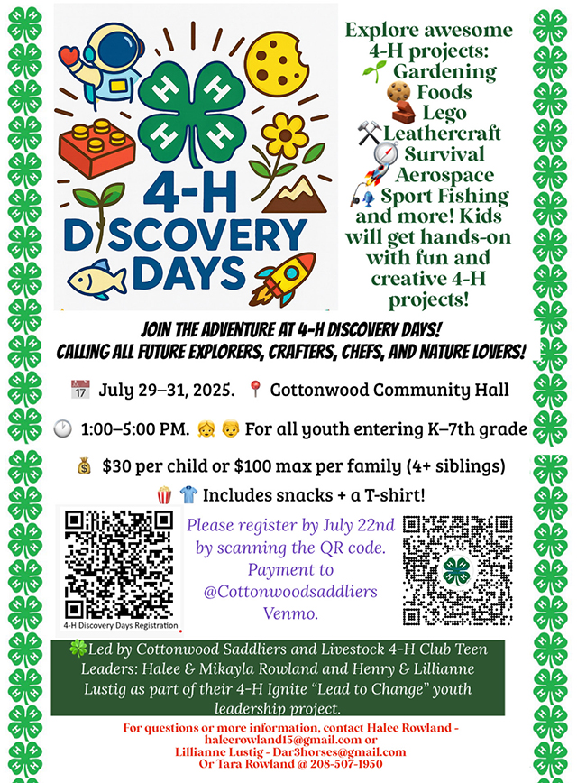 4-H Discovery Days are coming up July 29-31 at the Community Hall. Click on the photo for a larger view.