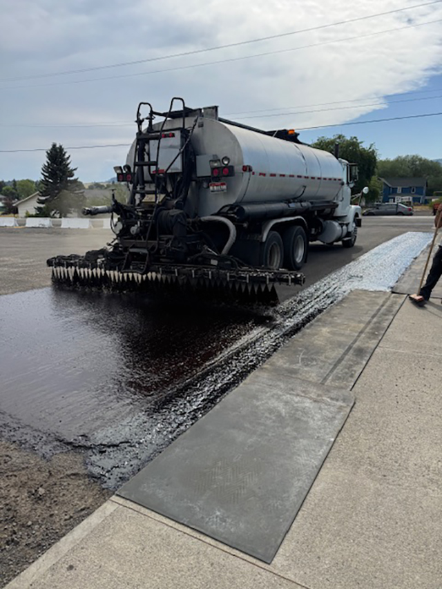On Thursday, July 31 the city crew helped put a BST surface on the parking lot and streets around behind the Elementary School. See story above left for more photos. Photo by Jon Rehder. Click on the photo for a