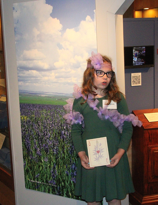 named Mt. Idaho, I was responsible for making it flourish. JERRY JOHNSON (Malek Davarpanah)I became the postmaster for a time and established a blacksmith shop. I replaced Milner’s tavern with a larger hotel, built a sawmill and a flour mill. You may not know that Idaho County was established as part of the Idaho Territory before Idaho ever became a state! I served two terms in the Idaho Territorial Council and was able to pass a bill in 1875, to make Mount Idaho the new county seat which helped my businesses tremendously. I donated the land for the new courthouse I also brought the first Hereford cows to the Camas Prairie and owned 6,000 sheep. I expanded my business holdings to Cottonwood -- building a post office, blacksmith shop and hotel there too! Sarah and I owned the Mount Idaho Hotel until my death in 1896. Mt. Idaho faded away when the county seat moved to Grangeville in 1902. ![]() Cody Uptmor portrayed Loyal P. Brown at the Living History event. Photo by Carla Wilkins. In 1886, Billy Rhodes and I discovered a silver ore deposit near Blacklead Mountain. I knew it would take too much money to develop it so wanted nothing to do with it. I was only interested in placer gold, but Billy stayed to mine. Billy Rhodes has a road and mountain named after him even though he didn’t do anything particularly important. I liked the upper Lochsa and had a cabin in the area of what is now known as Jerry Johnson Hot Springs. In 1893, I was in my cabin when members of the ill-fated Carlin Hunting Party came by. The six fools went on a poorly planned hunting trip and became trapped by high mountain snows. They built rafts to try to raft down the Lochsa. They wanted me to keep their camp cook, George Colegate as he was dying from a bladder issue. I didn’t want him and he didn’t want to stay with me. He was eventually abandoned by the group as he was too sick to walk when they couldn’t raft any further. His grave is located beside U.S. Hwy 12 at the Colgate Licks rest area which was named after George simply because he died near there. You can read about us all in the book Snowbound. I died at age 73 in 1911, and am buried in Wallace, Idaho. In addition to Jerry Johnson Hot Springs, Jerry Johnson Campground on the Lochsa River is named after me for no other reason than I was nearly the only person living near there. Other places around Idaho County that were named after people who did not do anything particularly important are Doumecq which was named after a French farmer and they named Riggins after its Postmaster which had a better ring to it than its previous name of Gouge Eye. You can find my picture in the pinochle deck, but I’m not in the poker deck. ![]() Malek Davarpanah portrayed Jerry Johnson, the one Jerry Johnson Hot Springs is named for, at the Living History event. SUE MCBETH (Taylor Wilkins) I was born in Scotland, in 1830. My sister Kate and I immigrated to the United States to be Presbyterian missionaries.After Henry Spalding’s death in 1874, we went to Kamiah and built upon the previous missionary work done by him. The Kamiah Presbyterian Church was built in 1874 is now the oldest protestant church in continuous use in the State of Idaho. The cabin Kate and I built in 1880 to live in and use as a school also still stands and is listed on the National Register of Historic Places, along with the church. Kate and I provided education and religious instruction to the tribe. I taught religious instruction to the Nez Perce men and Kate focused on literacy and domestic education for the Nez Perce women. I was a scholar and gifted linguist and compiled a Nez Perce/English dictionary which aided our communication greatly! Around 1885, we encountered difficulties working with the government’s Indian agent, and we left Kamiah. I went to Mount Idaho and continued my work with the Nez Perce. Kate moved to Lapwai to work and wrote a book called The Nez Perces since Lewis and Clark, which gives the perspective of what our work entailed. I died in Mount Idaho in 1893 and am buried in the cemetery beside the Presbyterian Church in east Kamiah. Kate continued her work until her death twenty years later. ![]() Taylor Wilkins as Sue McBeth Camas Flower (Katie Uptmor) I am a blue camas flower