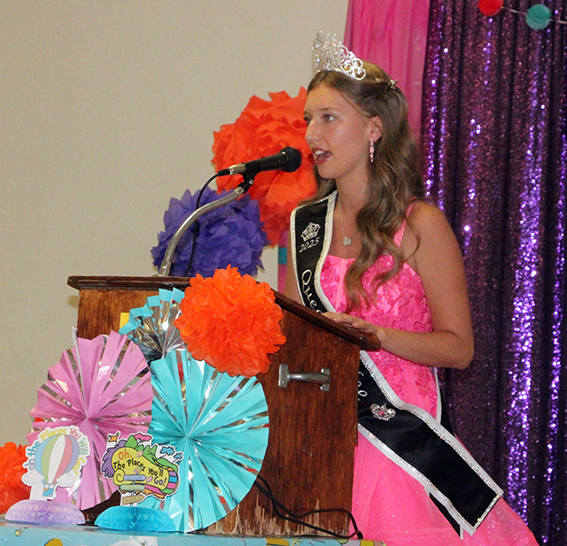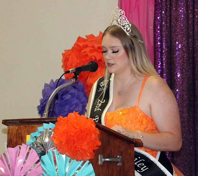 speeches. On Sunday, August 10, The 2025 Royalty held a Little Princess Tea Party. Photos from both events are shown below. The 2025 Royalty and 2026 candidates are pictured below in the order they gave their speeches: ![]() Fair Queen Halee Rowland gives her speech. ![]() ![]() 2026 candidates Mikayla Rowland and Bethany Stowell giving their speeches. ![]() 2025 First Princess Kimberly Seaver gives her speech. ![]()