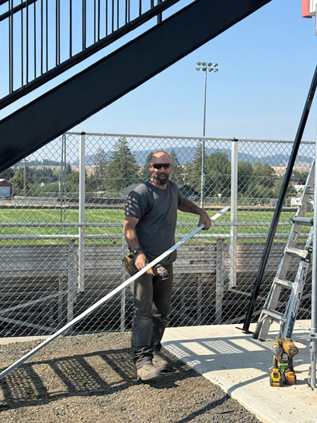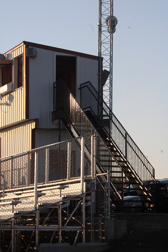 Fabrication, lower photo, built new stairs for the announcer booth at