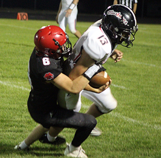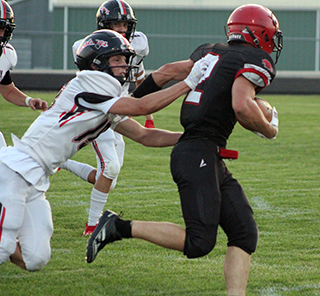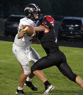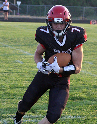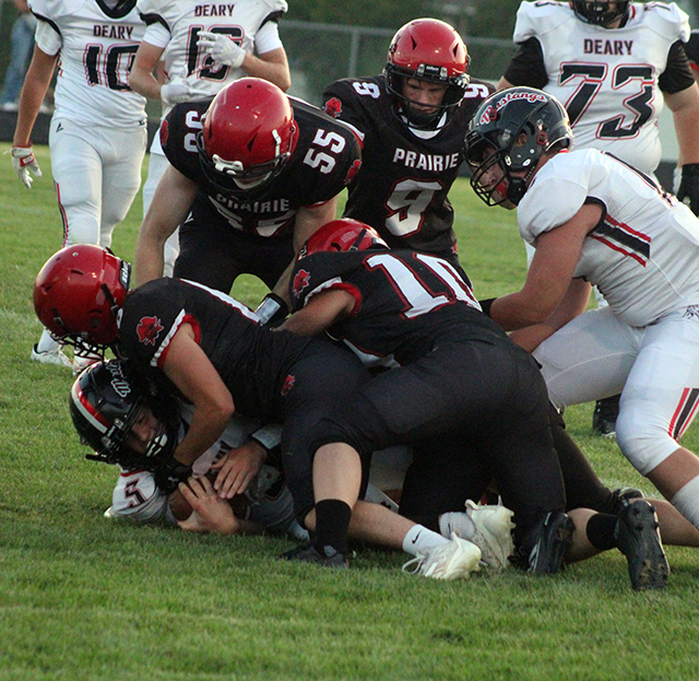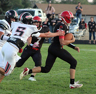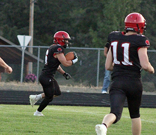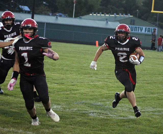 Pirates win big over Deary The Prairie Pirates rolled to a 58-8 win over Deary in their season opener at Cottonwood Friday, August 29. ![]() The Pirates scored on 5 of their 6 first half possessions as they built a 38-0 halftime lead. Prairie received the opening kickoff and took over at their own 31. Chris Schumacher picked up 16 yards on the first play from scrimmage and Levi Gehring followed with a 10-yard run. Junior quarterback Kade Quintal then threw a short pass to the right to Schumacher who picked up another first down with an 18 yard gain. Quintal then passed to Levi McElroy for a 13 yard gain to move the ball to the 12. Schumacher gained 8 yards on a run to the right. Gehring then went up the middle for 4 yards and the first touchdown of the game. Gehring then ran in the 2-pointer to make it 8-0. Deary made 1 first down on their possession before turning the ball over on downs at their own 47. Quintal scrambled for 19 years on first down to move the ball to the 28. After 2 plays netted -1 yard, Quintal tossed a screen pass to the left to Schumacher who raced down the sidelines and into the end zone for a 29 yard scoring play. Gehring again ran in the 2-pointer to make it 16-0. Deary started their next possession at their own 13 after they were unable to handle Lane Mader’s kickoff and had to start their kickoff return at the 6. Deary moved out to the 23 where a false start set them back 5 yards. On the next play Schumacher tipped Deary quarterback Jarrett Keen’s pass and McElroy intercepted at the 26 and returned the ball to the 24. Two plays later Quintal threw a pass to Peyton Stamper to the left and Stamper went 22 yards for his first varsity touchdown. Quintal then ran in the 2-pointer to make it 24-0 with 1:33 left in the first quarter. Deary’s next possession didn’t last long as they fumbled the ball away on their first play after the kickoff return. Gehring recovered the ball at the Deary 15. However, a holding penalty and a 10 yard loss on a sack moved Prairie back to the 26. A fourth down pass attempt fell incomplete and Deary took over on downs. Deary was unable to move the ball and punted back to the Pirates. Gehring fielded the punt at the 50 and returned it to the Deary 25 but a penalty for an illegal block brought it back to their own 49. Gehring had a big gain on the next play but a holding penalty called most of it back. Quintal then completed a screen pass to the left to Schumacher that went for 30 yards down to the Deary 23. Another holding penalty 2 plays later pushed Prairie back to the 33. On the ensuing play it appeared that disaster had struck as the center snap sailed over Quintal’s head. Quintal was able to retrieve the ball back at about the 45 and then was able to carry the ball for a 22 yard gain and a first down at the 11. Quintal picked up 2 yards on the next play and then tossed to Gehring who took the ball around left end for a touchdown. The 2-point pass failed as Prairie now led 30-0. Deary had to punt again on their next possession and Prairie took over at the Deary 46. On the next play Gehring took the ball around the left side, evaded several tacklers and hurdled a defender laying on the ground on his way to a 46 yard touchdown. Schumacher ran in the 2-pointer to make it 38-0. Deary had their biggest gain of the first half on their next possession with a 31 yard pass completion. A 13 yard loss 3 plays later forced them to punt again. The first half ended on the punt play. Deary had the ball to start the second half and wound up having to punt on 4th and 11. Prairie took over at their own 45. Two plays later Quintal passed to McElroy for a 31 yard gain to the Deary 21. Prairie then ran 5 straight running plays with Schumacher scoring the touchdown from the 1. Gehring ran in the 2-pointer to make it 46-0. That invoked the running clock mercy rule for the final 18:30 of the game. Mader’s ensuing kickoff went into the end zone and Deary started tat their own 20. They wound up turning the ball over on downs at the 29 as Keen was stopped just short. Prairie put their second unit offense on the field with Stamper and Marshall Weber in at running backs and McElroy moving from receiver to quarterback. Stamper appeared to have scored on a 23 yard run but it was called back on a holding penalty. McElroy then completed a 9 yard pass to Stamper and a 14 yard pass to Cooper Riener to convert the first down at the 11. Weber gained 2 yards then Stamper went up the middle for his second touchdown of the game. The 2-point try came up short as Prairie now led 52-0 early in the fourth quarter. Deary then put together their only scoring drive of the game against Prairie’s 2nd team defense. They went 75 yards in 9 plays and added the 2-pointer to make it 52-8 with 5:18 to play. Weber had a 40 yard return on the kickoff to set Prairie up at the Deary 39. On third and 10, freshman Isaiah Warren scored his first varsity touchdown on a 39 yard run. The 2-point run came up short leaving Prairie with a 58-8 lead. Time ran out on the ensuing kickoff return. Gehring wound up with 80 yards rushing on 10 carries. Quintal added 53 on 8 carries, Warren 29 on 1 carry and Schumacher 31 on 7 carries. Prairie totaled 221 yards rushing on 32 attempts. Quintal was 6 for 7 for 143 yards while McElroy was 2 for 2 for 23 yards and Sam Rehder was 0 for 1. Schumacher caught 3 passes for 77 yards while McElroy caught 2 for 44. Stamper caught 2 for 31 and Riener caught 1 for 14. Prairie had 387 total yards. Keen Led Deary with 73 yards rushing on 11 attempts. They had 104 yards rushing on 27 attempts. Keen was 5 for 14 with 1 interception for 29 yards passing. Schumacher led in tackles with 5 unassisted and 2 assists. Gehring had 1 unassisted tackle, 8 assists and 1 fumble recovery. Mader had 9 assists. Weber had 2 unassisted tackles and 3 assists. Stamper and Trajan Elven each had 1 unassisted tackle and 5 assists. Benny Secrest had 1 unassisted and 4 assists. Ashton Mart